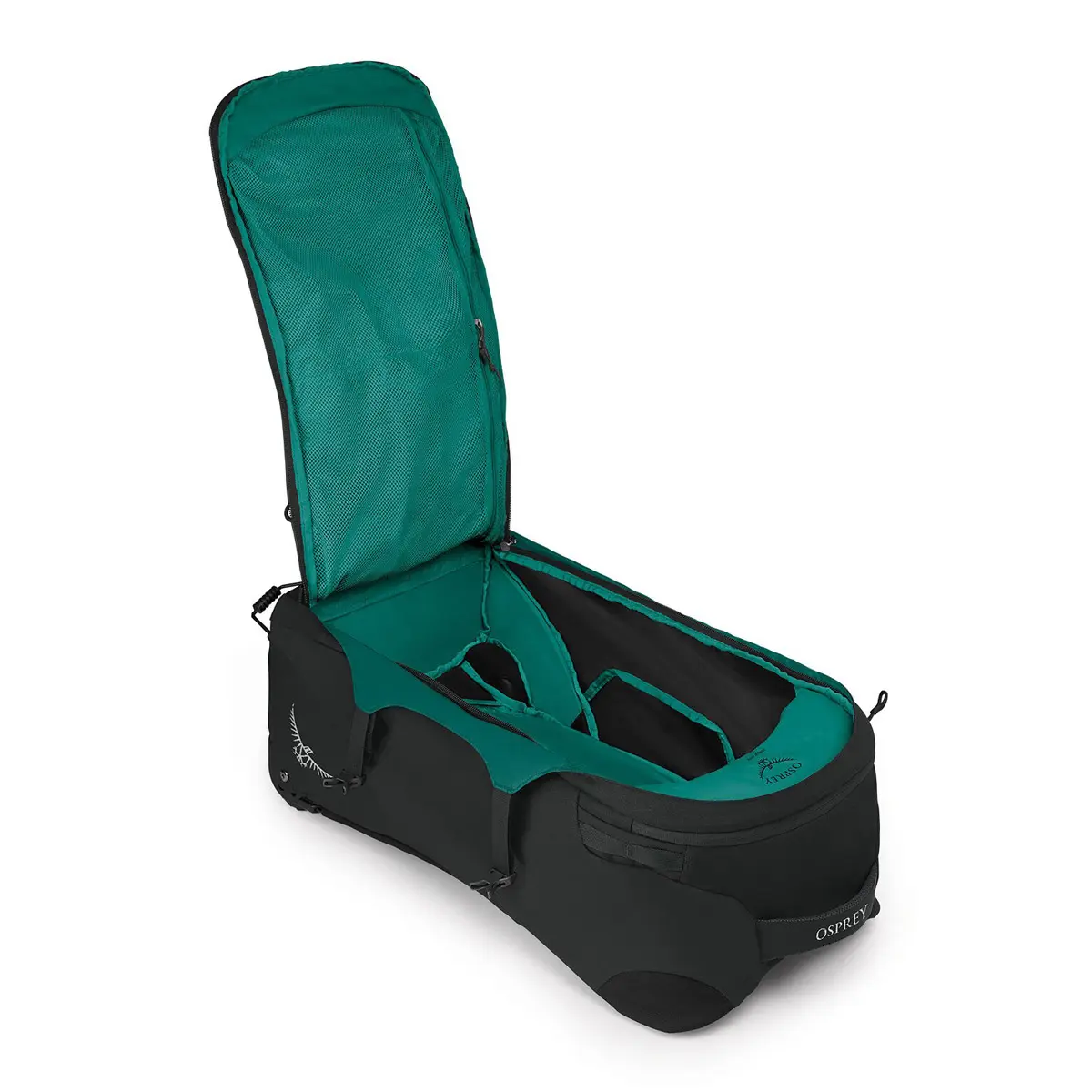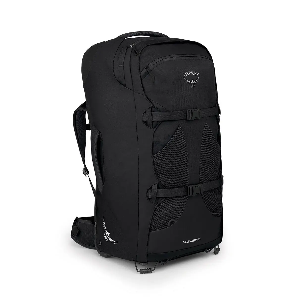 ファーポイントウィールドの女性用モデル。背負うと転がす、2つの運び方ができるトラベルパック。背負う場合は背面のジッパーは開けショルダーハーネスと折り紙式に収納されたヒップベルトを展開。転がす場合は背面上部のハンドルバーを引き出します。メインコンパートメントのジッパーはロッカブル仕様。