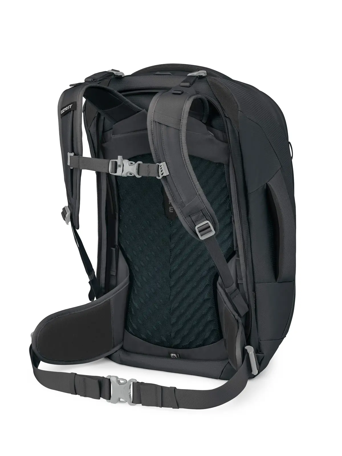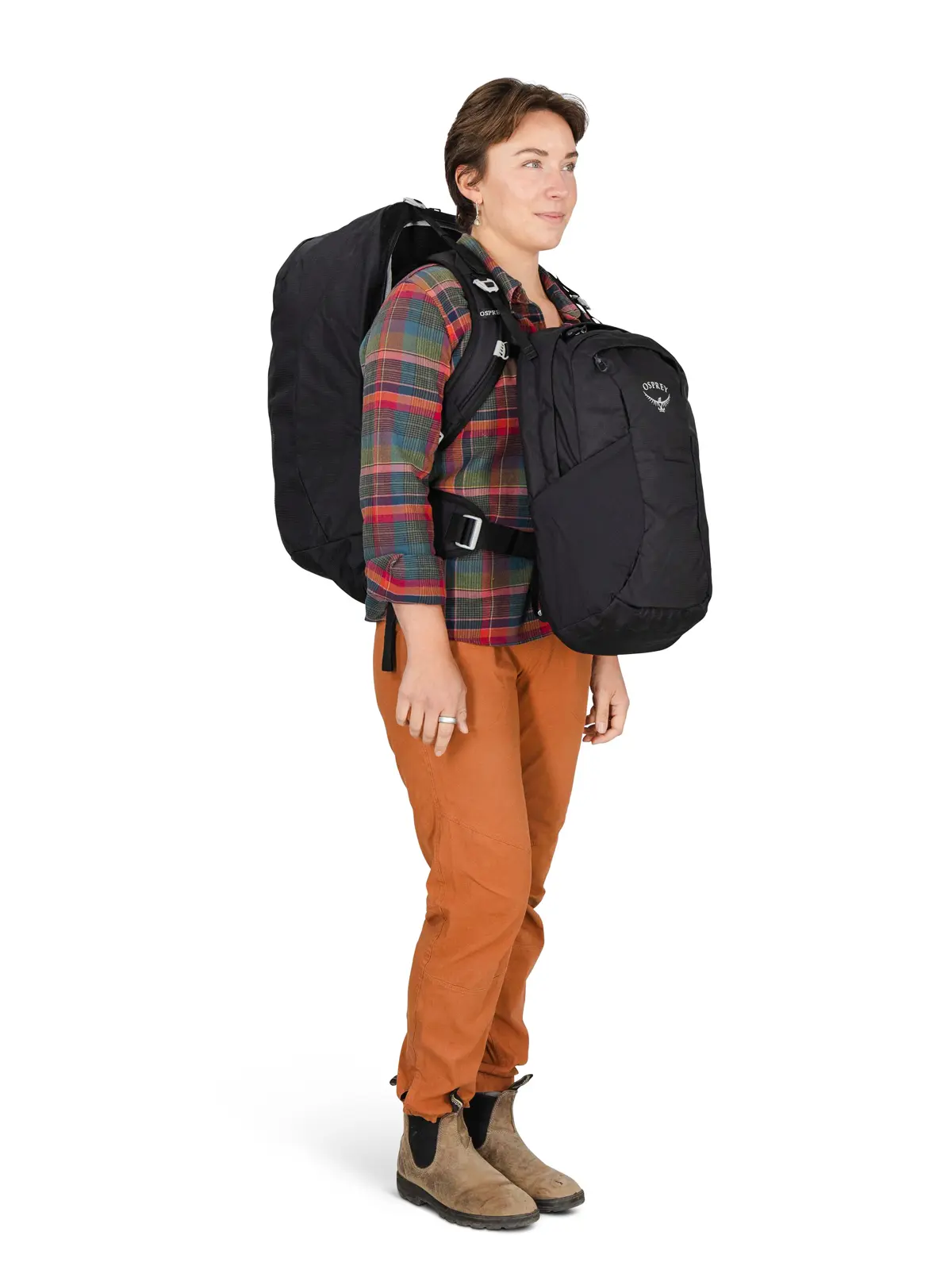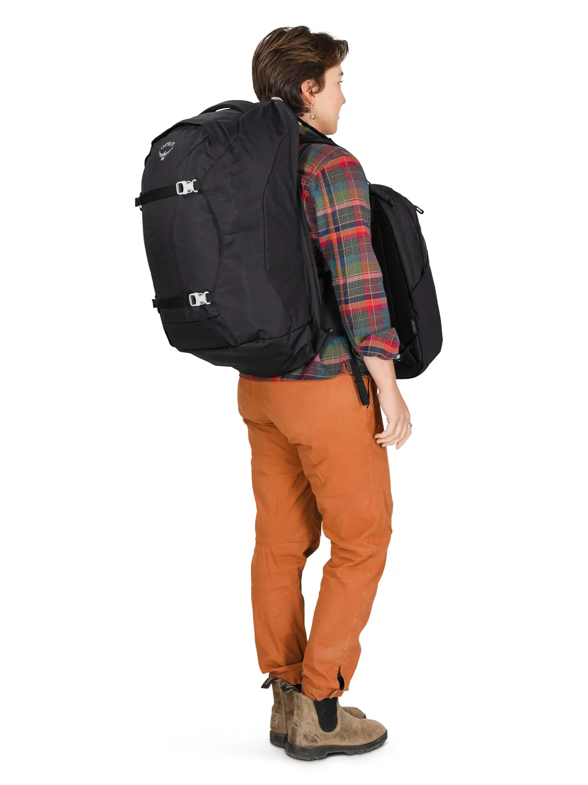 フェアビュー55は短期の出張から旅行まで幅広く活躍する汎用性の高いサイズ。40リットルのメインパックに15リットルのファーポイント/フェアビュートラベルデイパックが付属しています。デイパックは単体で使用できるほか、パックの正面やショルダーベルトに取り付けが可能です。