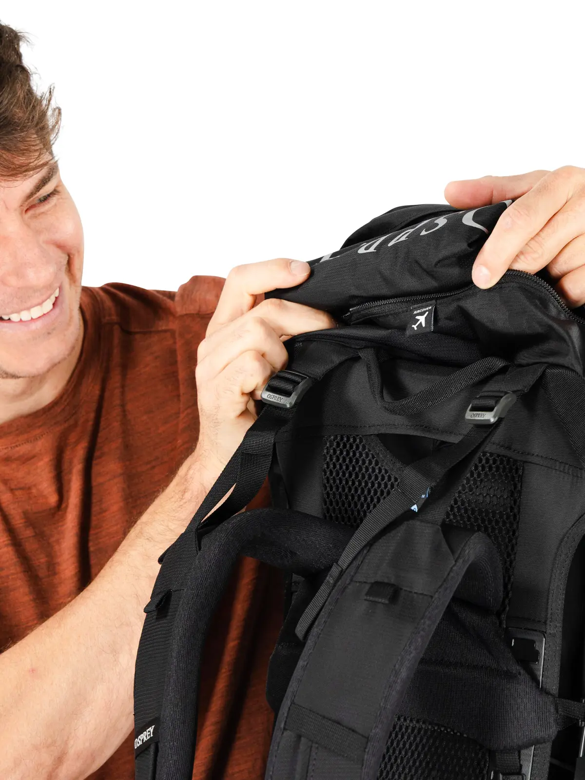 背面には通気性の良いベンチレーション構造(エアスピードサスペンション)を採用しているほか、背面調整機構も備え、テクニカルパック譲りの背負い心地と、旅行での使いやすさを両立しています。メイン荷室は大きく開くジッパー仕様で荷物の詰込みがしやすく、より耐久性に優れた生地を採用しています。付属のエアカバーはレインカバーの他、チェックイン時のカバーとしても使用できバックパックを擦れやキズから守ります。