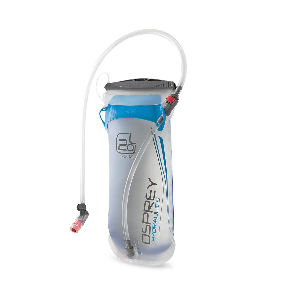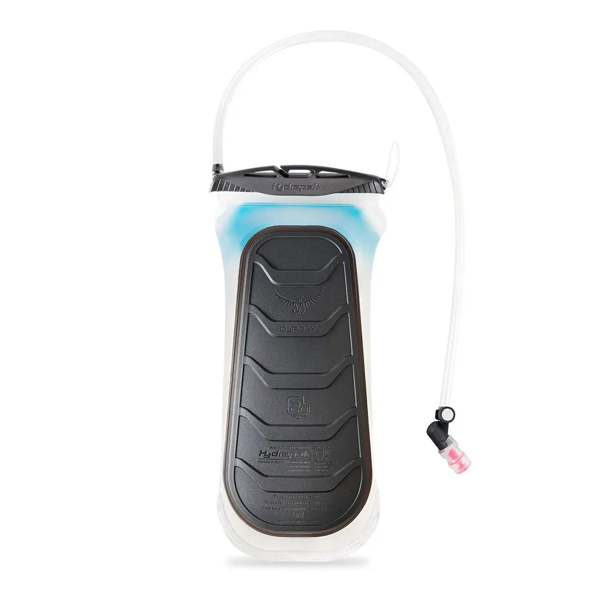 レザヴォアはオスプレーの給水パック。大/中型パックに適した「レザヴォア」(青)と、軽量パックに適した「レザヴォアLT」(赤)の2種類。「レザヴォア」は背面にプレートを溶着したモデルで、フルパッキングしたバックパックでもスムーズに出し入れできます。また、ワンタッチでホースを分離/接続できるクイックコネクトを備え、ショルダーベルトにホースを固定したまま、本体だけをパックから取り出せます。