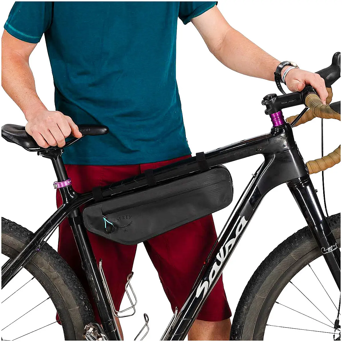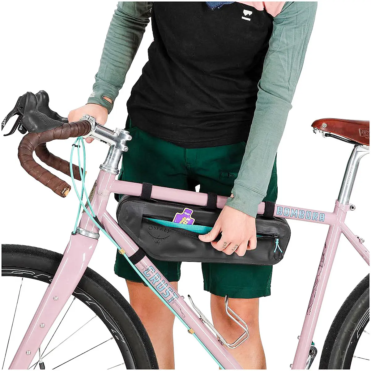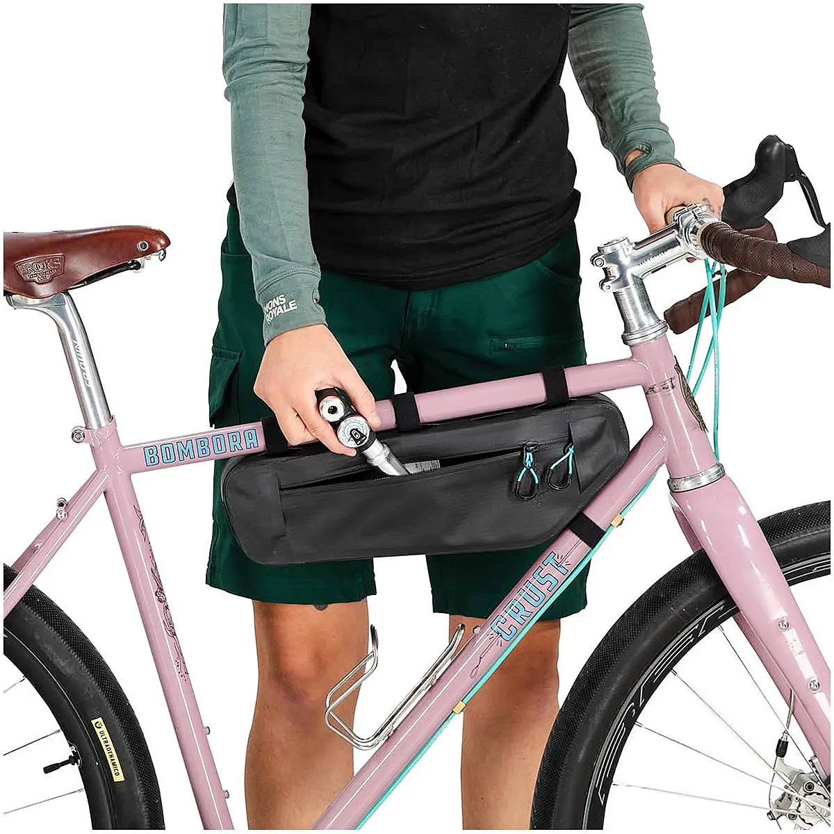 防水生地と止水ジッパーを採用したフレームバッグ。PFASフリーのDWR加工が施されたリサイクル210Dナイロンの生地と大きなフラップでカバーされた止水ジッパーが雨風や泥汚れから中の荷物を保護します。形が崩れにくくペダリングへの干渉を防ぐスリムな設計。左右ふたつの収納スペースは大小に分かれています。右側のメインコンパートメントは走行時でも取り出しやすいよう、前後どちらからもアクセスできるダブルエンドのジッパーを採用。左側の収納スペースは内側にポケットが設けられています。様々なフレームサイズや形状に対応する3つのサイズ展開で、ロードバイク、クロスバイク、マウンテンバイク、グラベルロードといった、様々なタイプのバイクフレームに取り付けることができます。ご自身の自転車フレームの大きさを事前に把握し、ボトルケージ等と干渉しないようサイズ選びを行ってください。