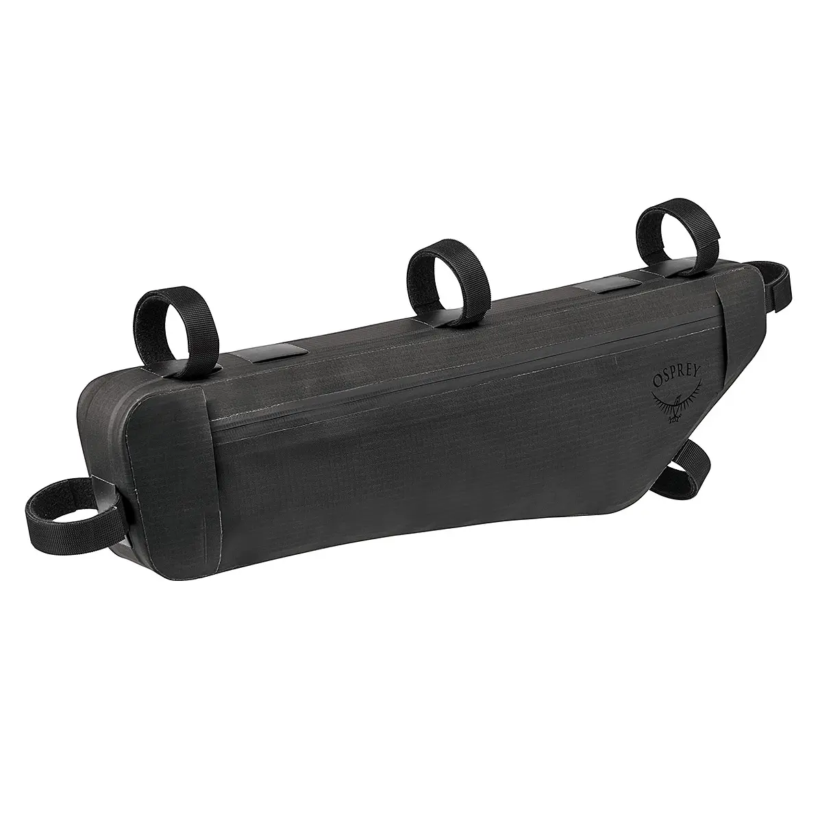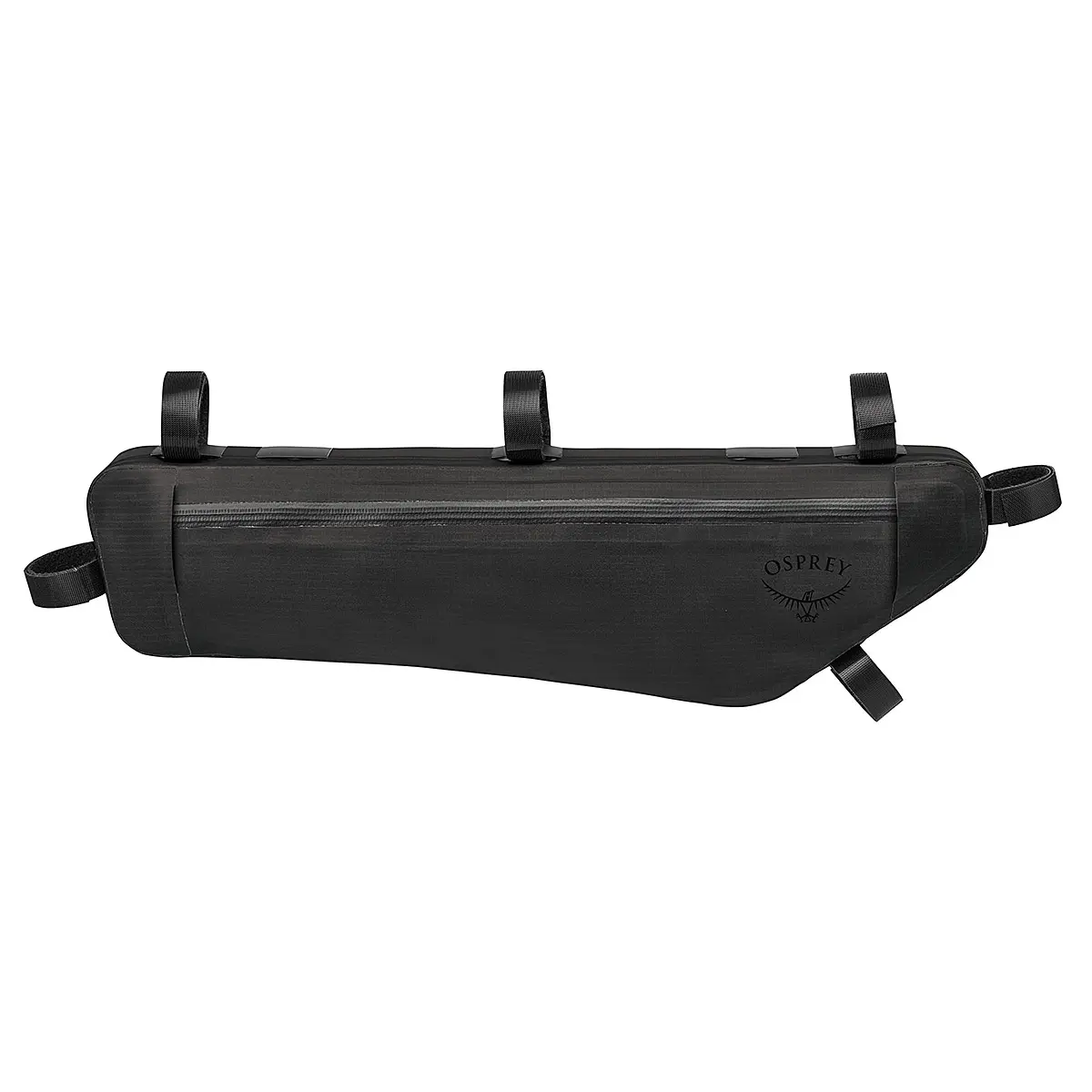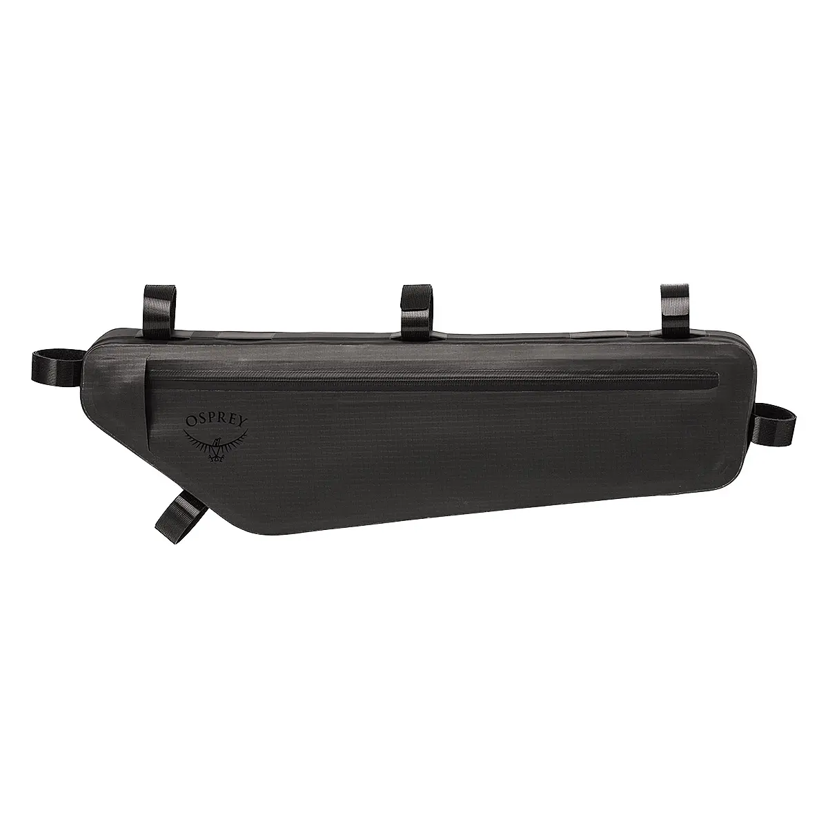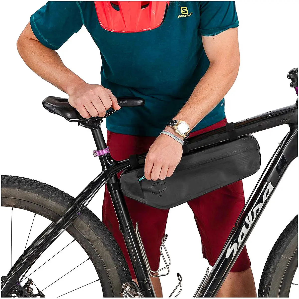 防水生地と止水ジッパーを採用したフレームバッグ。PFASフリーのDWR加工が施されたリサイクル210Dナイロンの生地と大きなフラップでカバーされた止水ジッパーが雨風や泥汚れから中の荷物を保護します。形が崩れにくくペダリングへの干渉を防ぐスリムな設計。左右ふたつの収納スペースは大小に分かれています。右側のメインコンパートメントは走行時でも取り出しやすいよう、前後どちらからもアクセスできるダブルエンドのジッパーを採用。左側の収納スペースは内側にポケットが設けられています。様々なフレームサイズや形状に対応する3つのサイズ展開で、ロードバイク、クロスバイク、マウンテンバイク、グラベルロードといった、様々なタイプのバイクフレームに取り付けることができます。ご自身の自転車フレームの大きさを事前に把握し、ボトルケージ等と干渉しないようサイズ選びを行ってください。
