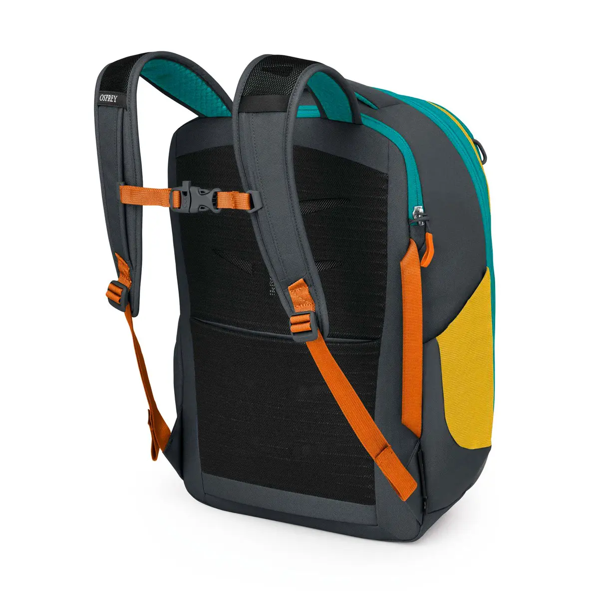 軽量フレームシートに凹凸のあるダイカットフォーム材を接着し、表面をメッシュでカバーした背面構造はエアスケープサスペンションと呼ばれ、安定したフィット感と通気性、背負った時の動きやすさをサポートしてくれます。スリーブ形状の背面パネルをハンドルに通しホイールバッグに取り付けて移動することも可能です。