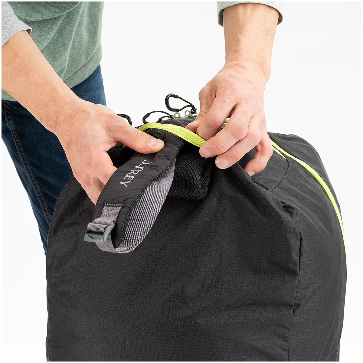 エアポーターは飛行機、車、船などでの移動中に発生する汚れやダメージからバックパックを保護するカバー。収納できるショルダーストラップ、ネームホルダー、2箇所のキャリーハンドルを備え、鍵を取り付けできるメインジッパーは旅先での保安性を高めます。使用しない時はトップポケットに収納できます。bluesign®認証リサイクル素材100%。