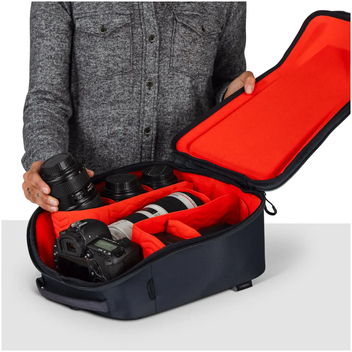 カメラやレンズ、ドローンなどのカメラ機材を整理、保護するバッグインタイプのパッド入りカメラケース。お気に入りのバックパックと組み合わせることで高価な機材を安全に持ち運びできます。