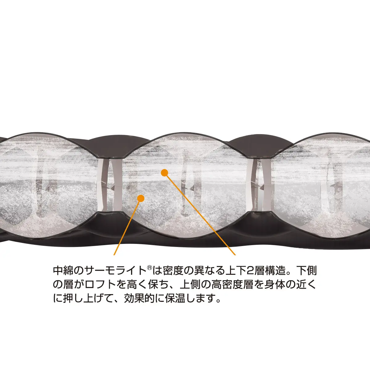 厚さ10cmのイーサーライトXTのインサレーションをブースト。エアスプラングセルに内蔵された2層のサーモライト中綿が、軽量コンパクト性は失わずに、熱の対流を防ぎ保温性を高めています。6.2という高いR値(ウィメンズは6.3)を誇り、低温時の冷たく固い凹凸の上でも、快適性や保温性を保ちます。