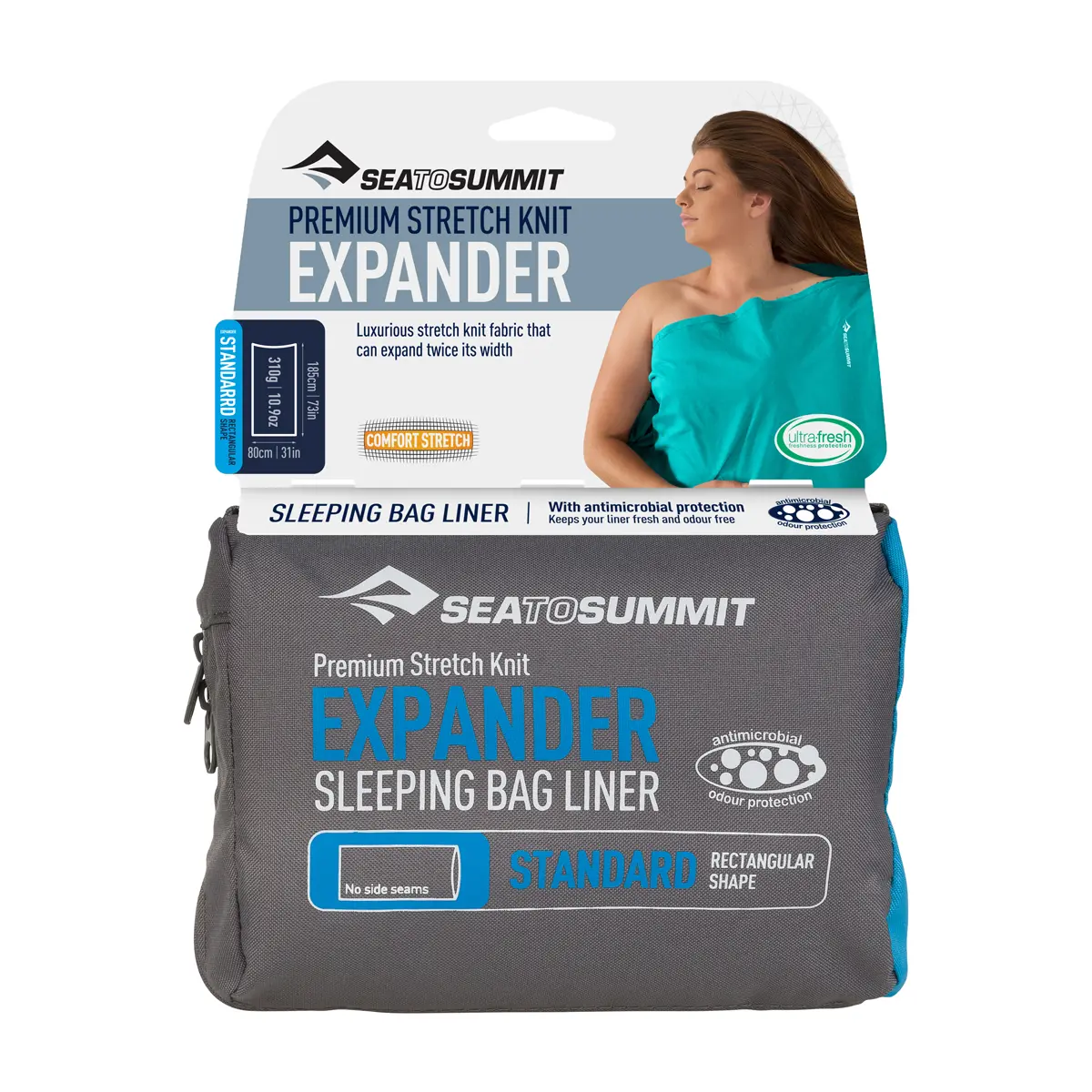 ポリコットン、ストレッチニット製で、一般的なコットンライナーよりもストレッチ性と保温性に優れます。ストレッチにより睡眠中の動きを妨げず、快適性を高めもつれを防ぎます。抗菌加工によりバクテリアの繁殖を抑制し、ライナーとスリーピングバッグの両方を長持ちさせます。ナノ粒子を使用しない抗菌加工は洗濯によって剥離しません。この抗菌処理はEPA(アメリカ合衆国環境保護庁)により認証され、多くの病院で採用されています。