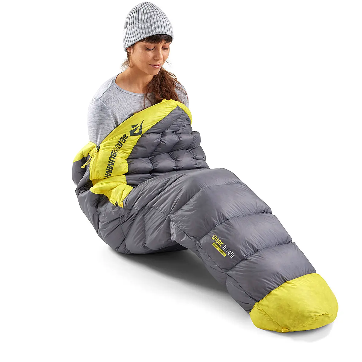 スパークは軽量コンパクトさと優れた保温性を両立させた最上位シリーズです。ウィメンズモデルは女性の身体にあわせて肩周りは狭めに腰回りは広めに再設計。また単位面積あたりの中綿量も同クラスのユニセックスモデルと比べて大幅に増量し、保温性能を高めています。撥水トリートメントされた850+フィルパワーのウルトラドライプレミアムグースダウンは、ウェットコンディションでも最大の保温性を発揮。シェルとライニングは極薄の10デニール撥水ナイロン製で軽量化。結露したテント壁面に接するフードとフットボックスには防水透湿素材を使用し、濡れによるダウンの性能低下を防ぎます。