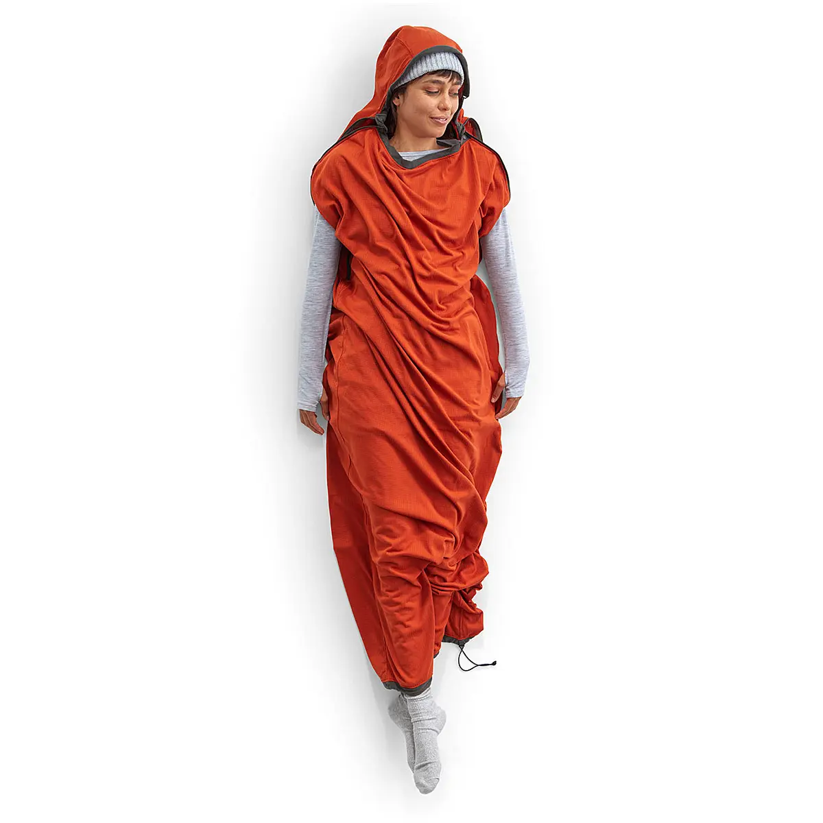 Thermolite®EcoMadeをグリッド状に仕立て、暖かさをプラスするリアクターシリーズ3モデルの中で最も厚手です。スリーピングバッグに暖かさを追加するのはもちろん、暖かい季節は単体で使うこともできます。側面はジッパー、足元はドローコードで大きく開くので、温度調節が容易で使い勝手もアップしています。