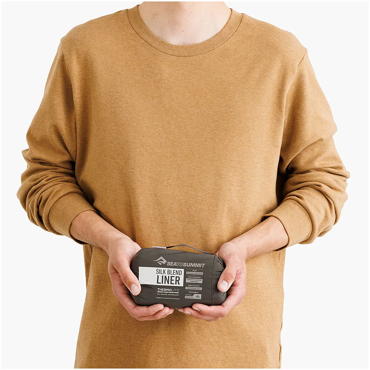 保温性に優れるThermolite®にシルクをブレンドしたラグジュアリーなライナー。薄くてかさばらずコンパクトに収納でき、さらっとした自然な肌触りが特長です。睡眠中の動きを妨げないよう、側面にストレッチパネルを設けています。