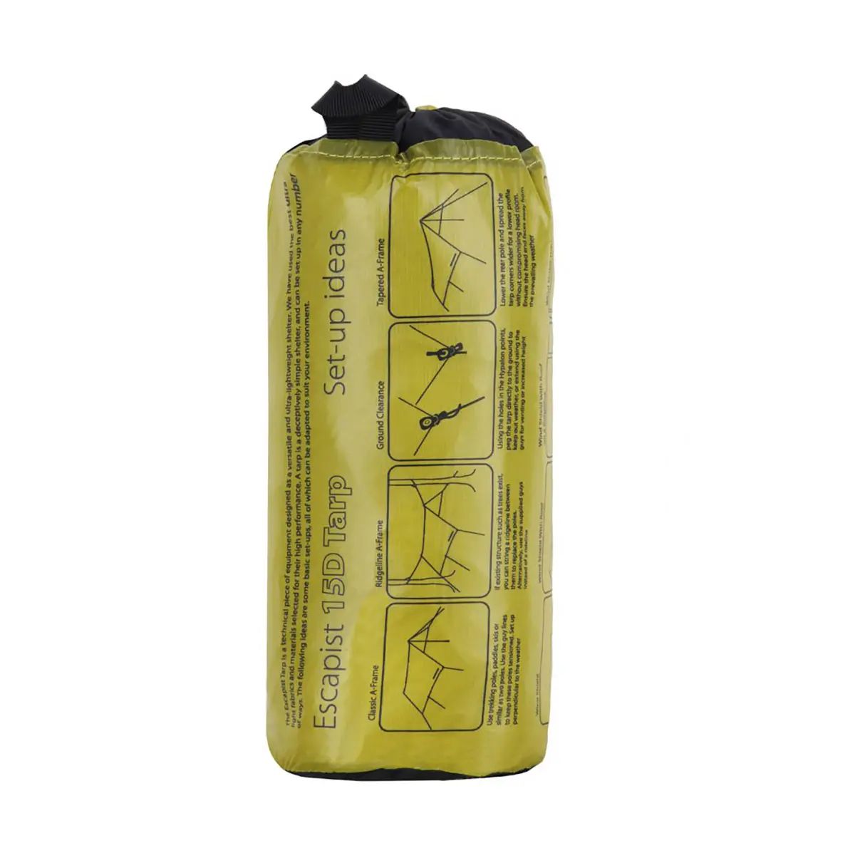 エスケーピストは15Dのシリコン/ポリウレタンコーティングが施されたウルトラ-シル®ナノファブリックで作られています。8箇所のハイパロン製張り綱取り付けポイントにはトレッキングポールの先端を通す穴が設けられ、コードアジャスター付のリフレクター付張り綱が予め通されています。これら8箇所の便利なアタッチメントにより、エスケーピストは様々な設営バリエーションを持ち、別売のエスケーピストメッシュインナーも簡単に取り付けることができます。ラージエスケーピストは3m×3m、重量440gで家型に設営した場合、2人用として快適な広さを持ち、テントの日除けとしても使用できます。ミディアムエスケーピストは2m×2.6m、重量300gで地面近くに家型に設営した場合、2人が寝るための充分なスペースを確保しています。