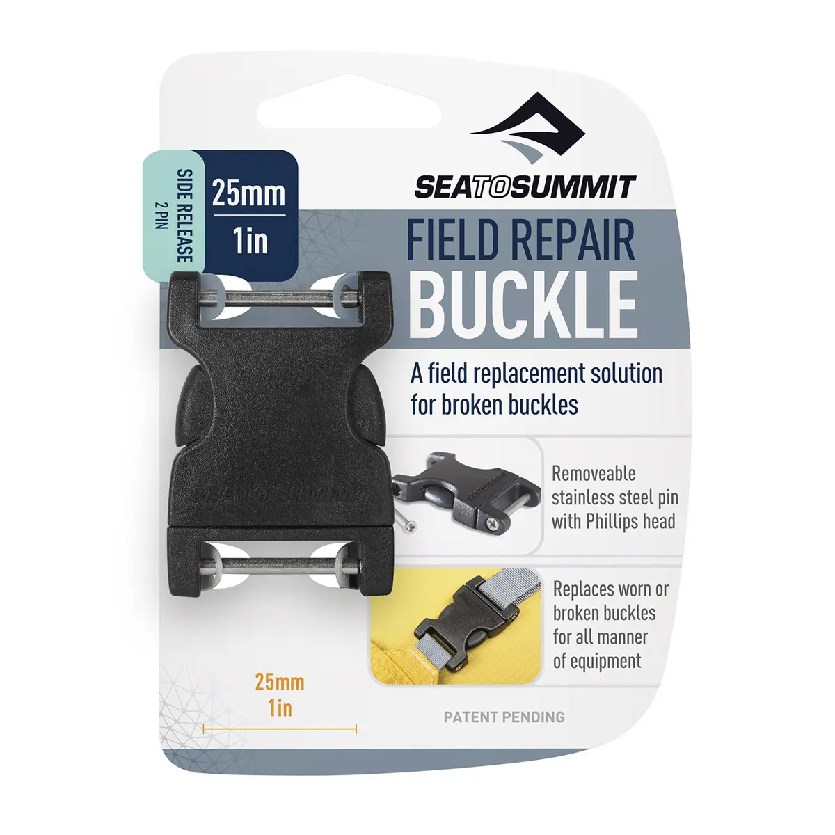破損や劣化したバックルをスクリューで簡単に交換できるのが特長のバックルです。バックルを破損したその場で交換でき、フィールドから帰って、新しいバックルを縫い込む必要がありません。
