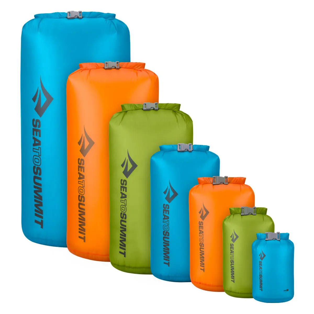 超軽量な15Dシルナイロン、軽量サイドリリースバックル、細めのロールトップクロージャーなどにより、ウルトラシルドライサックよりも30%も軽量なドライサック。装備の軽量化を図りたい方に最適です。