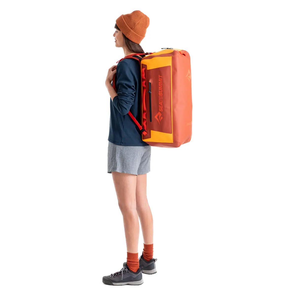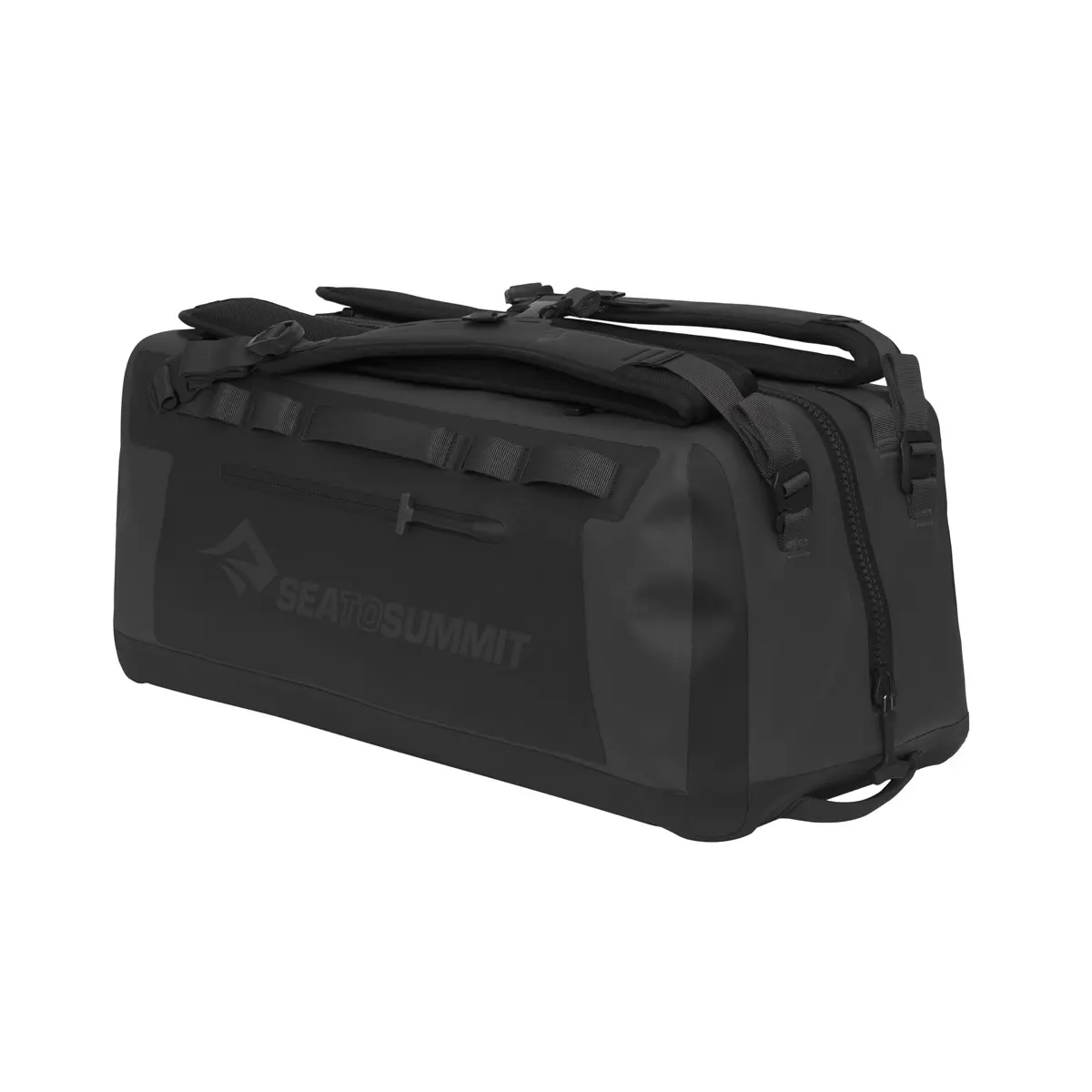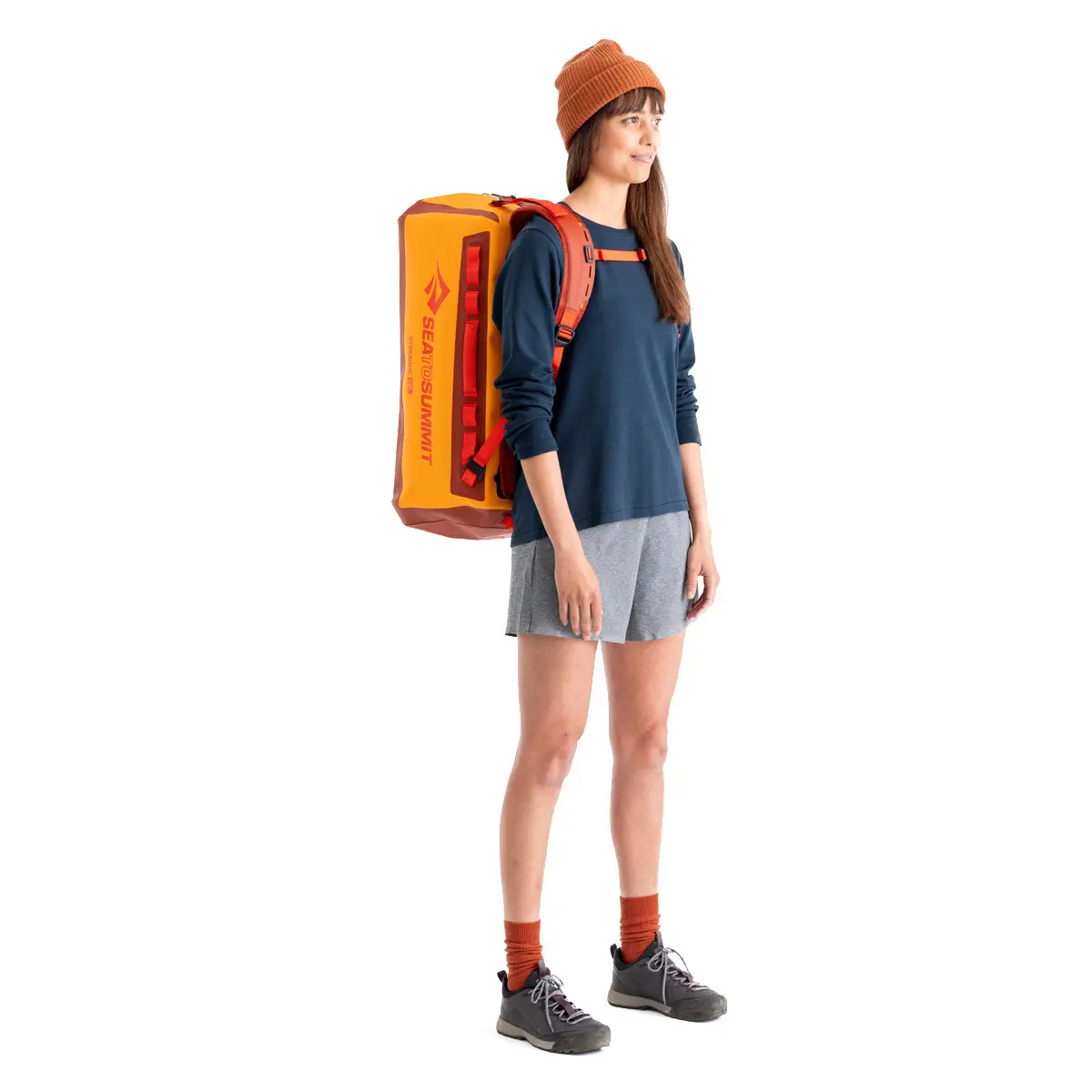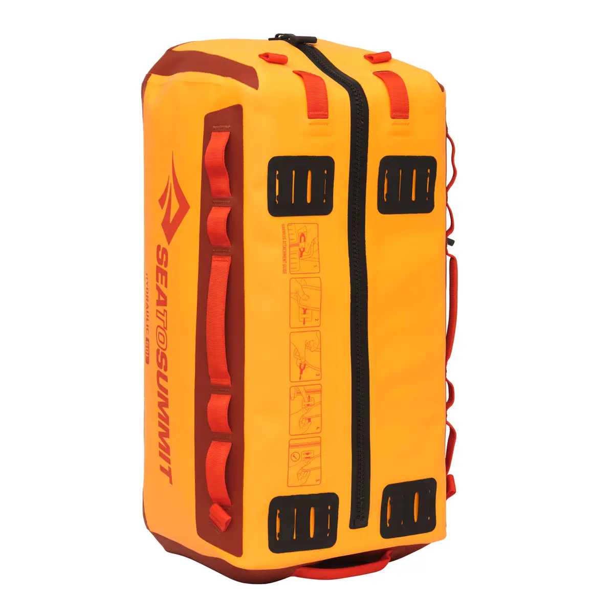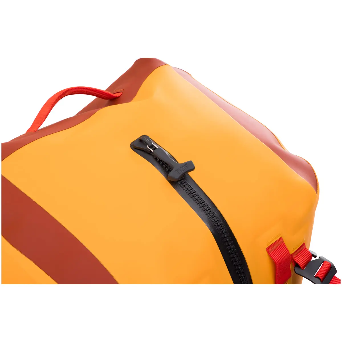 水没に耐えるダッフルスタイルのドライバックパック。厳しい環境に耐えるタフな造りです。水圧試験をパスするファスナーのTIZIP®マスターシールを採用し、極厚の1000D高強度生地は両面をTPUラミネート。全体は溶着構造でIPX8の防水規格を満たしています。取り外しと調節が可能なショルダーハーネスは、重い荷物でも身体の負担を軽減し、積載時には確実な固定が可能です。完全な四角形ではなくあえて形状を非対称にすることで、内部へのアクセスがしやすくなっています。