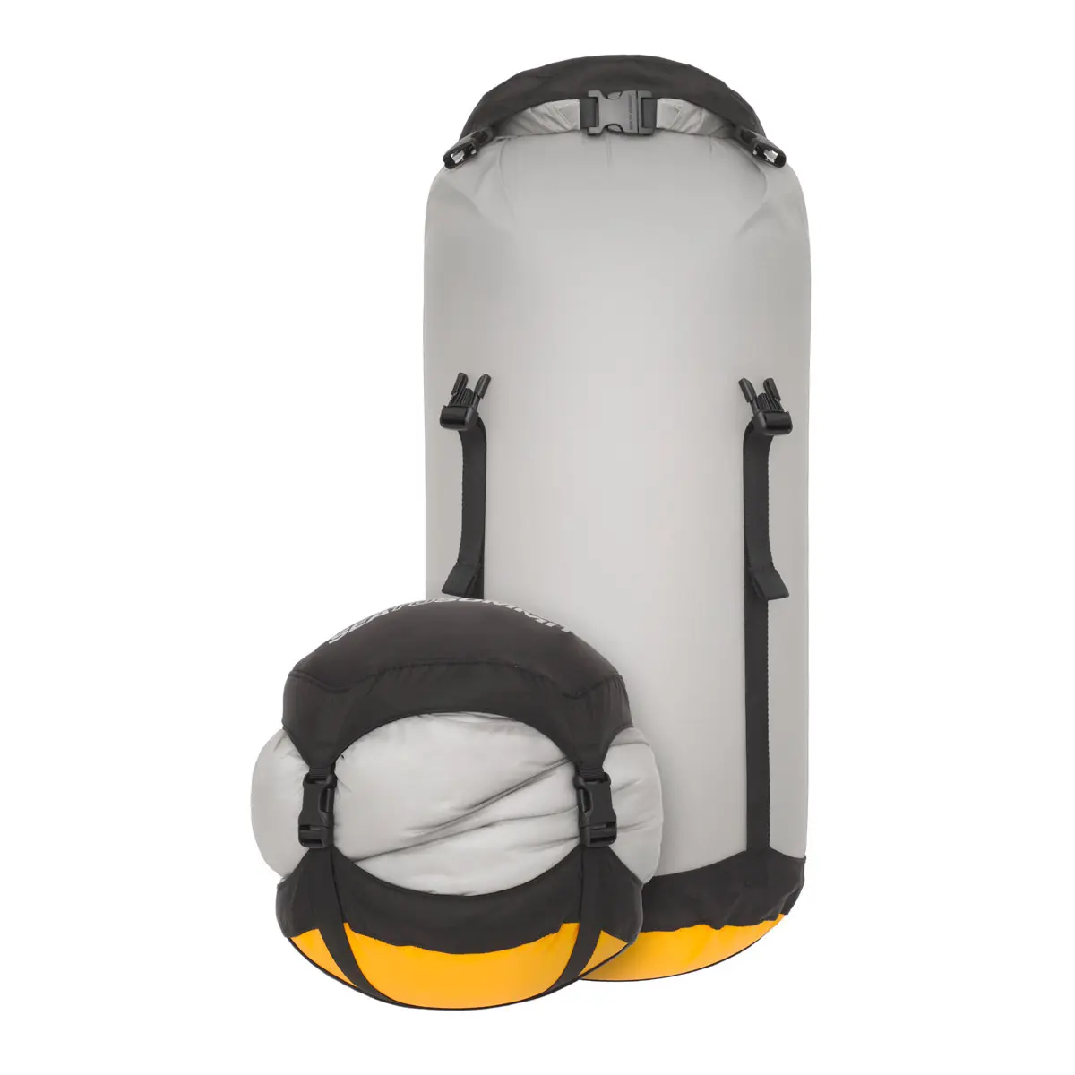 コンプレッションドライサックをベースにして、本体生地に30Dウルトラシルナイロンを使用、40%も軽量化したモデル。ボトムに使用されている防水透湿素材eVentファブリックは、空気は出しても水は入れない構造。バルブやストラップ締めによる圧縮ではなく、開口部をロールすることでボトムから内部の空気を逃します。防寒ウェアやスリーピングバッグなどかさばるギアを水濡れから守り、荷物をコンパクトに収納するのに最適です。ボトムはオーバル型で、平らに潰れてバックパックの内部形状にフィット。