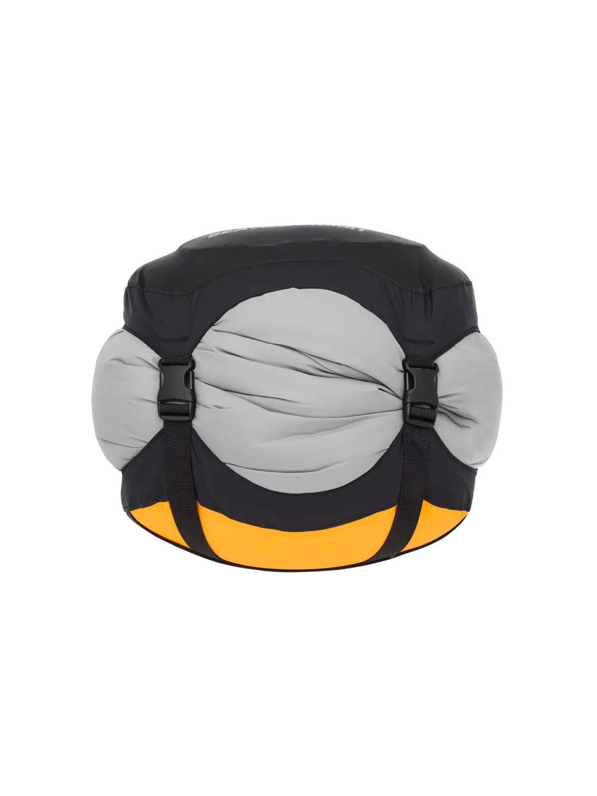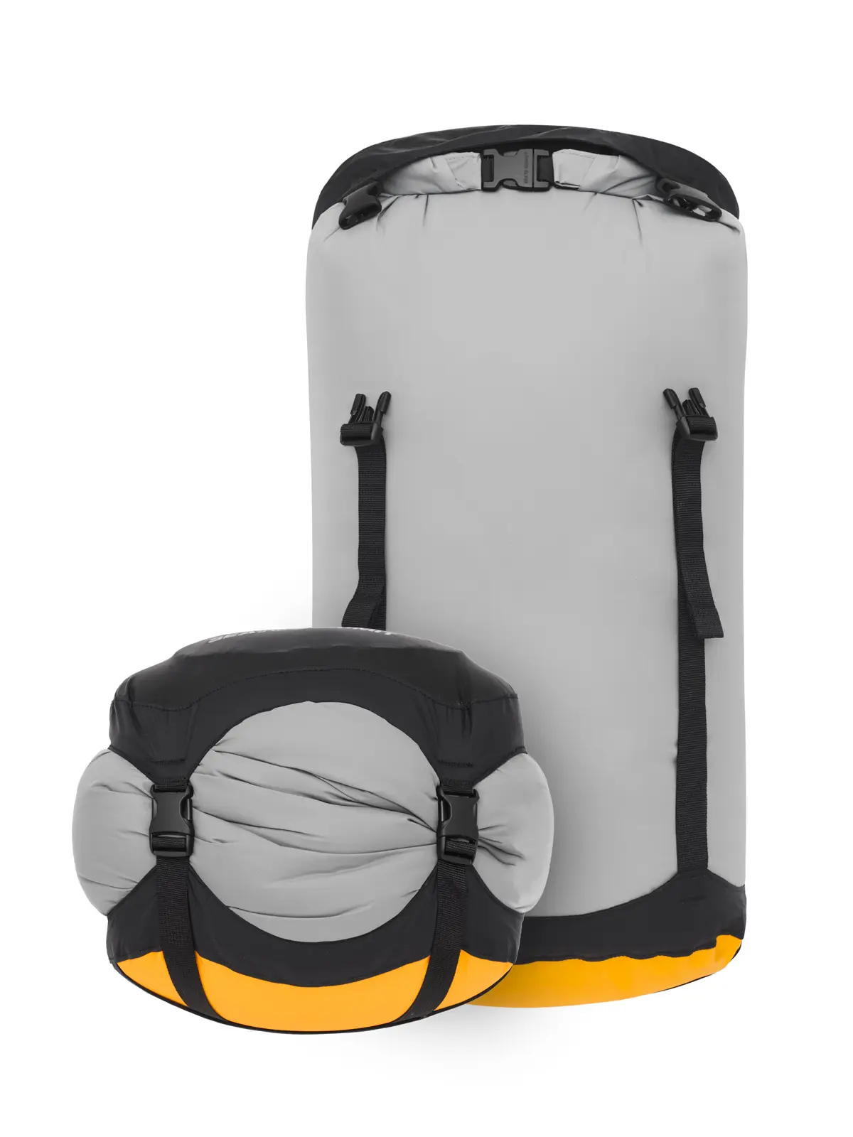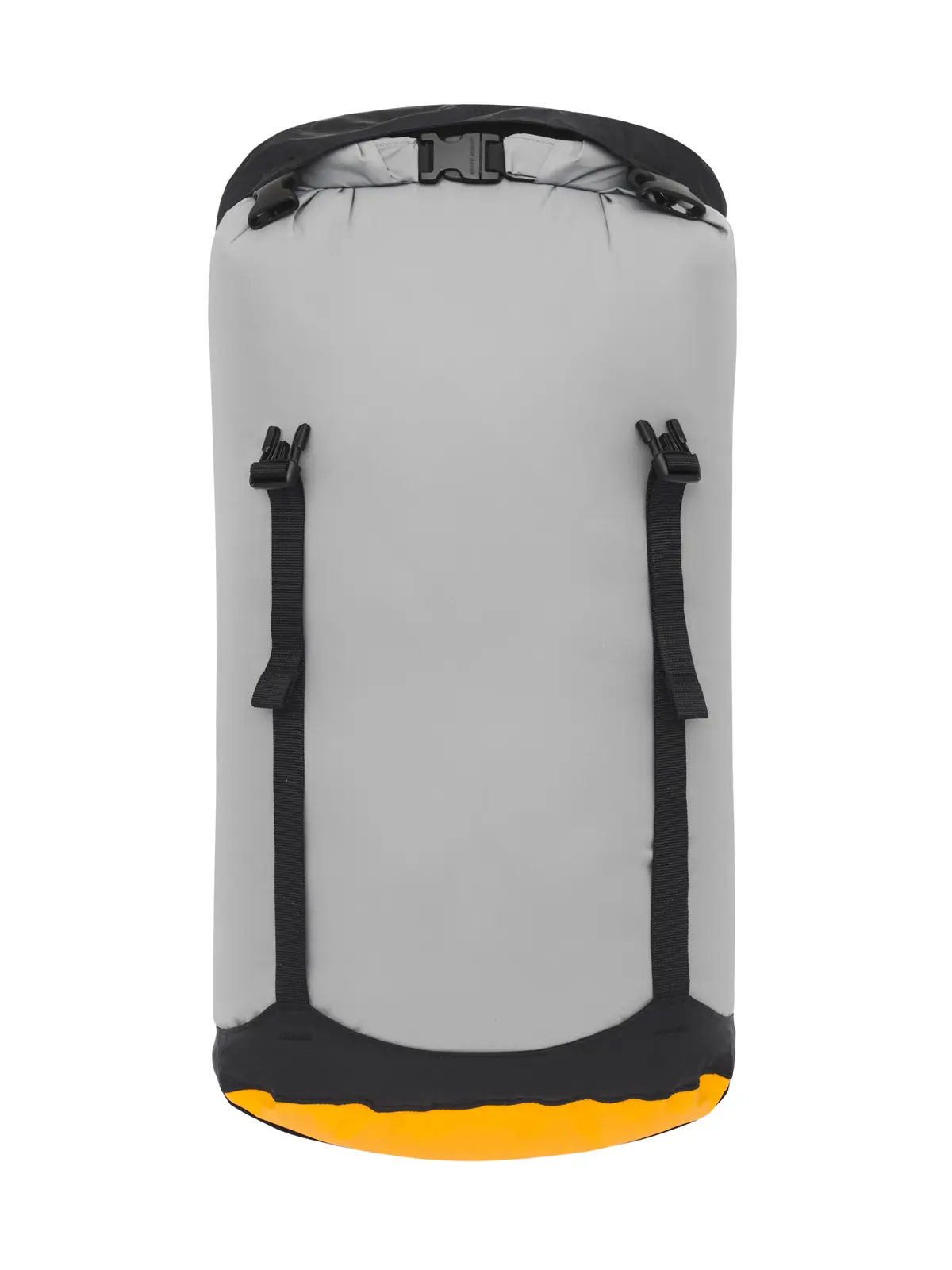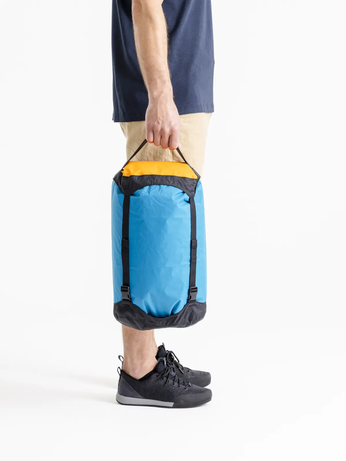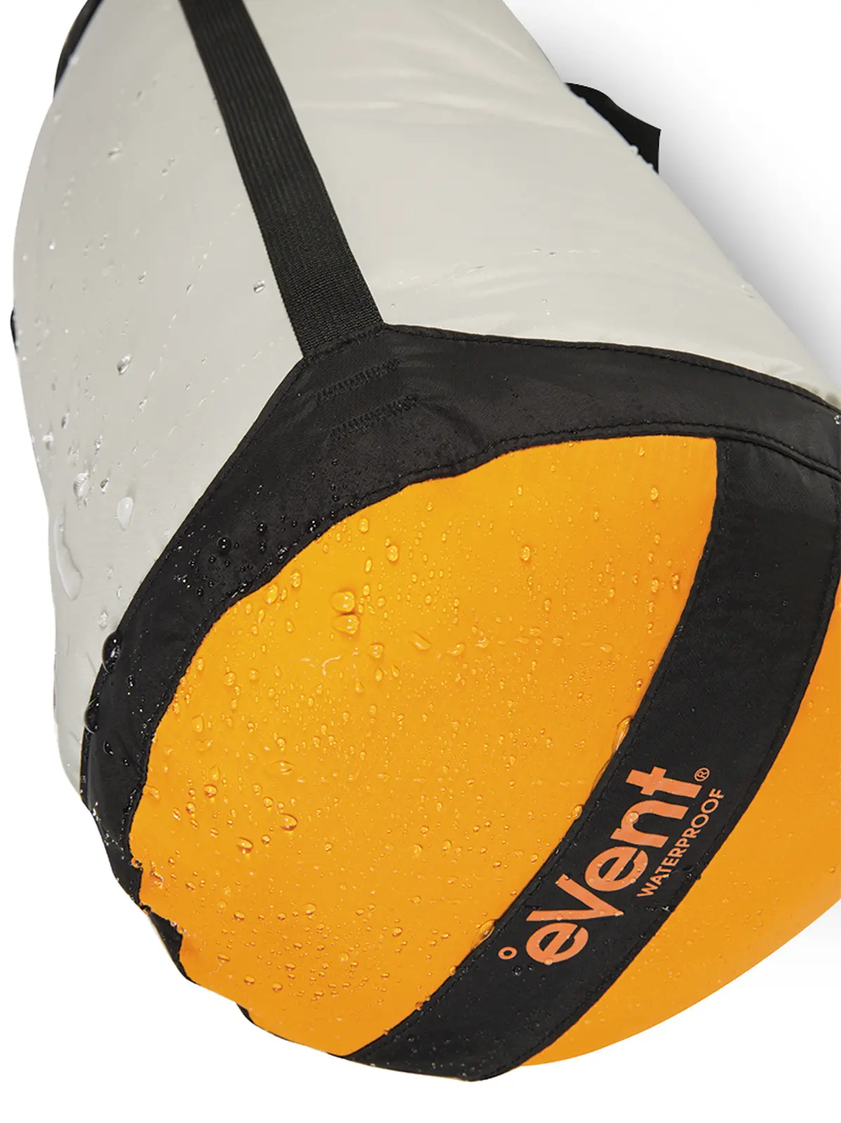 軽さ、防水性、耐久性のバランスに優れたコンプレッションバッグ。ボトムに使用されている防水透湿素材eVentファブリックは、空気は出しても水は通さない構造。バルブやストラップ締めによる圧縮ではなく、開口部をロールすることでボトムから内部の空気を逃します。防寒ウェアやスリーピングバッグなどかさばるギアを水濡れから守り、荷物をコンパクトに収納するのに最適。4本のストラップで、膨らみを抑えながら均等に荷物を圧縮することができます。ボトムはオーバル型で、平らに潰れてバックパックの内部形状にフィット。本体生地にはbluesign®認証の耐水圧10,000mmの70DリサイクルナイロンにPUコーティング、PFC不使用のDWR加工、二重縫製&テープシールで防水性を強化し、縫い目からの水の侵入も防ぎます。底面にはナイロン製オーバルハンドルがつき、内側は反射性の白いコーティングで、荷物が探しやすく便利です。