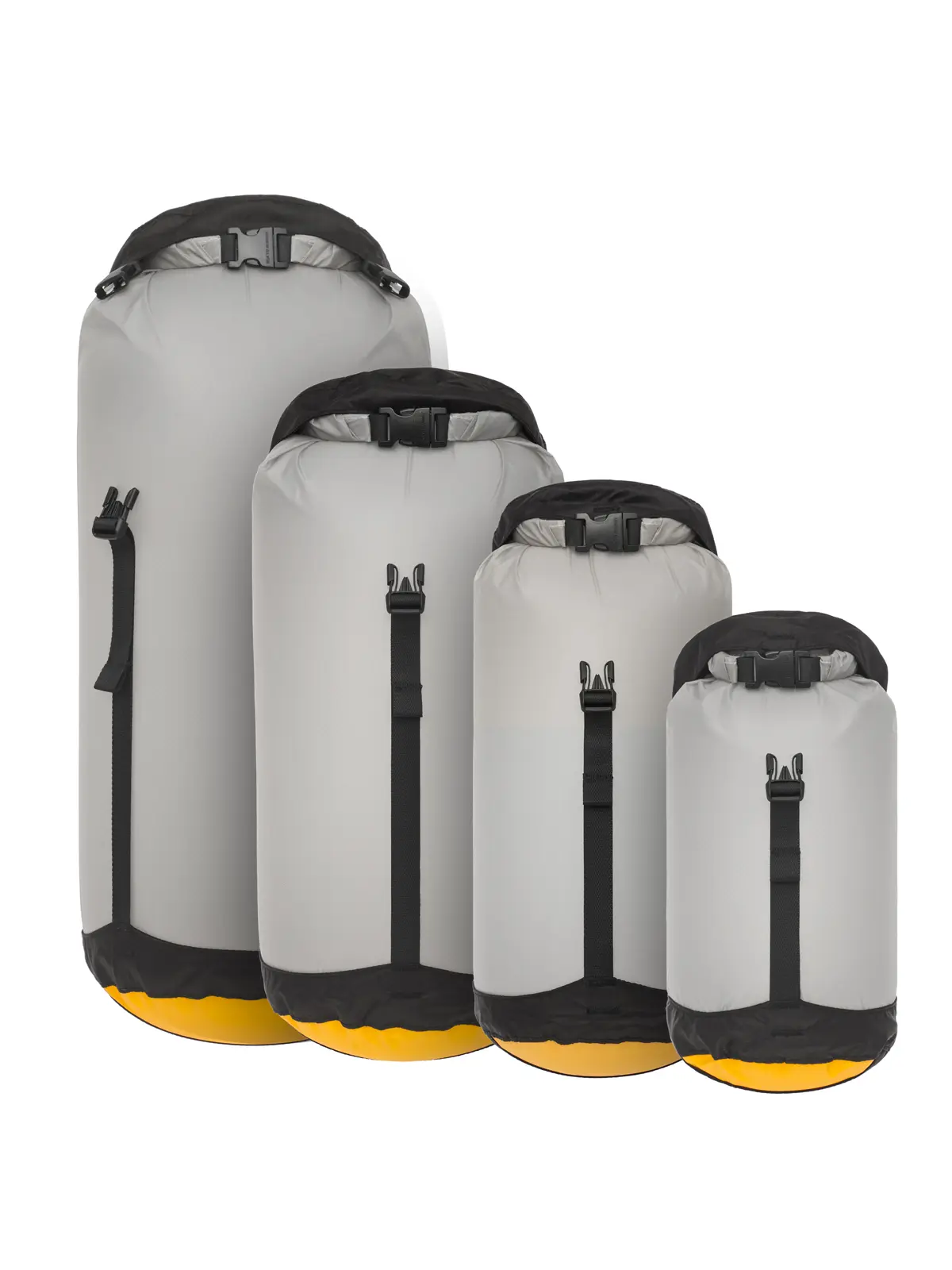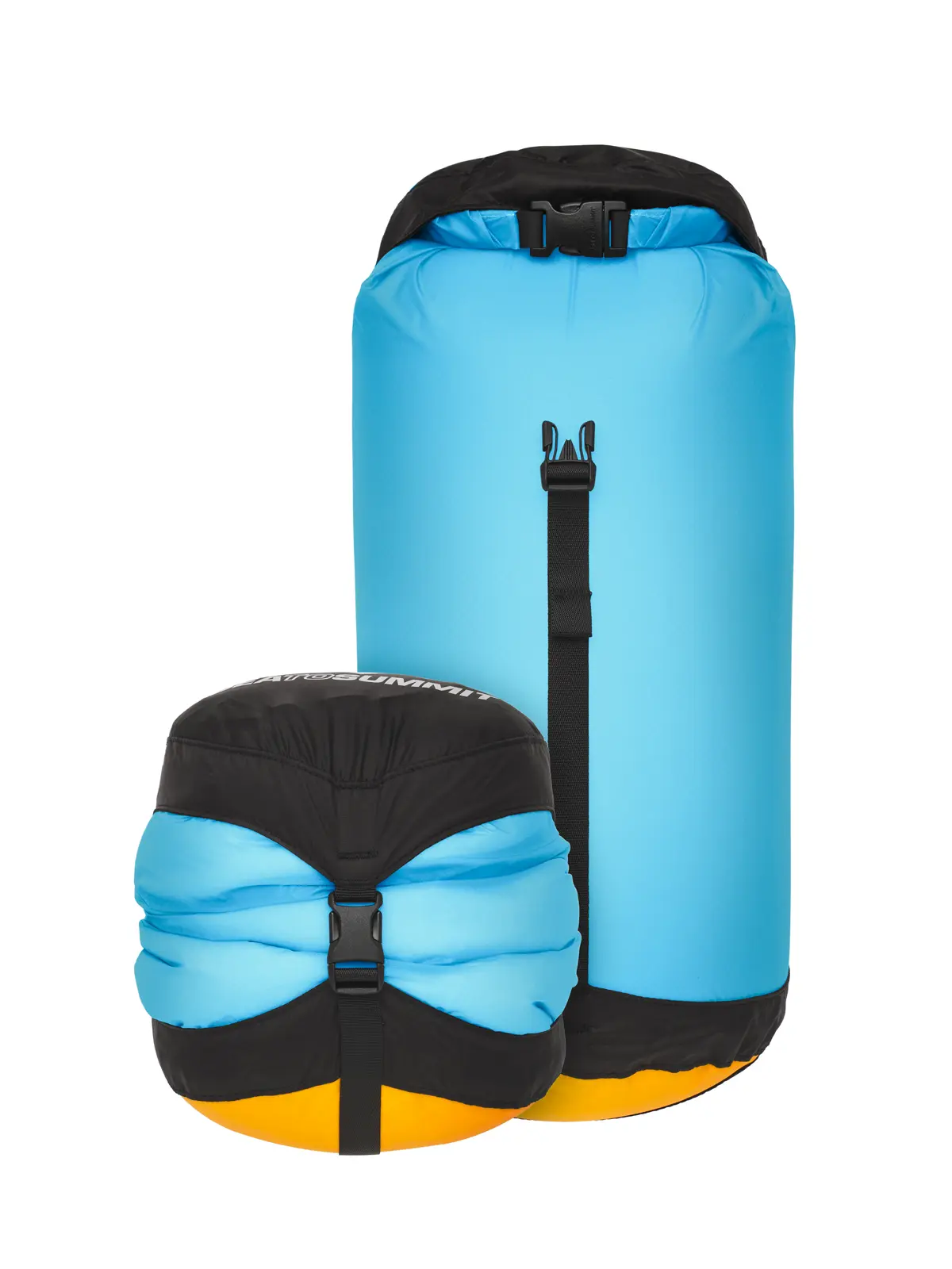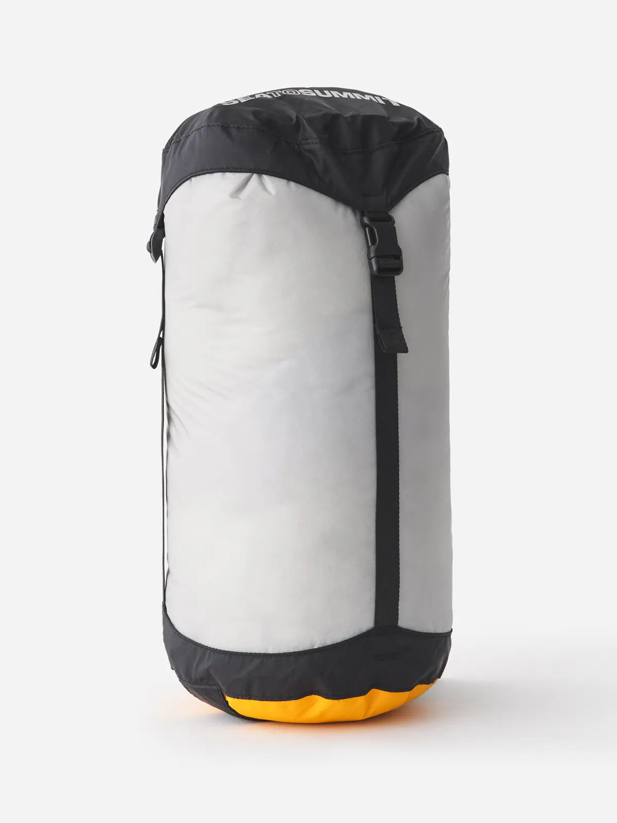 バックパックの内部収納に最適な、軽量ドライコンプレッション収納。コンプレッションドライサックをベースにして、本体生地に30Dウルトラシルナイロンを使用し、40%も軽量化したモデル。ボトムに使用されている防水透湿素材eVentファブリックは、空気は出しても水は入れない構造。バルブやストラップ締めによる圧縮ではなく、開口部をロールすることでボトムから内部の空気を逃します。防寒ウェアやスリーピングバッグなどかさばるギアを水濡れから守り、荷物をコンパクトに収納するのに最適。4本のコンプレッションストラップにより中身を均一に圧縮できます。ボトムはオーバル型で、平らに潰れてバックパックの内部形状にフィット。底面にはナイロン製オーバルハンドルがつき、内側は反射性の白いコーティングで、荷物が探しやすく便利です。