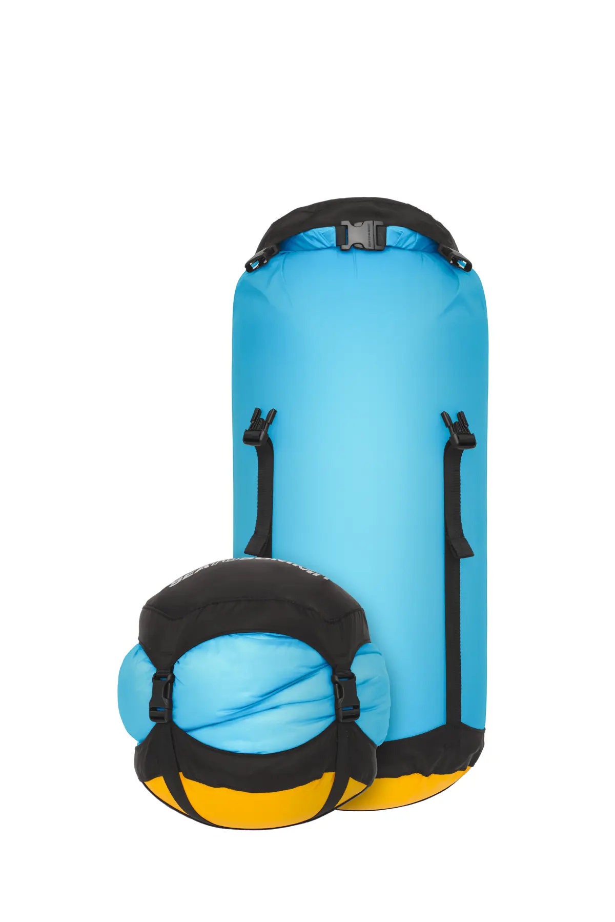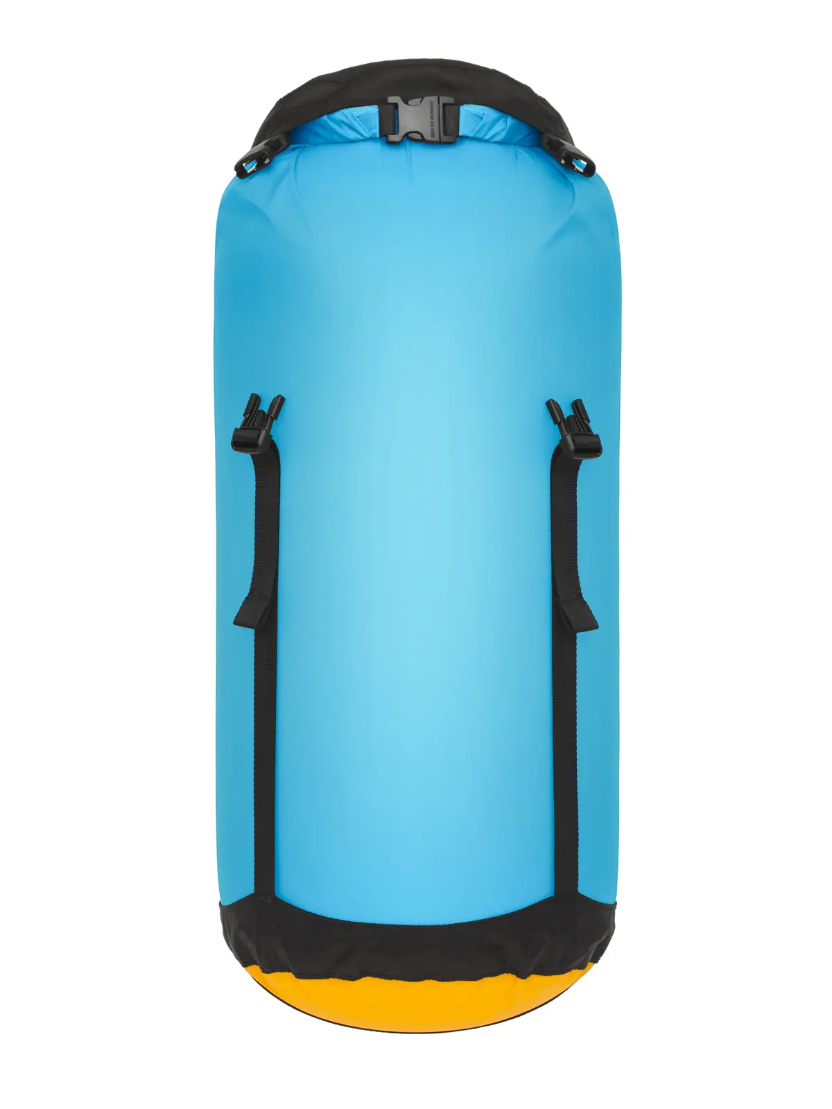 バックパックの内部収納に最適な、軽量ドライコンプレッション収納。コンプレッションドライサックをベースにして、本体生地に30Dウルトラシルナイロンを使用し、40%も軽量化したモデル。ボトムに使用されている防水透湿素材eVentファブリックは、空気は出しても水は入れない構造。バルブやストラップ締めによる圧縮ではなく、開口部をロールすることでボトムから内部の空気を逃します。防寒ウェアやスリーピングバッグなどかさばるギアを水濡れから守り、荷物をコンパクトに収納するのに最適。4本のコンプレッションストラップにより中身を均一に圧縮できます。ボトムはオーバル型で、平らに潰れてバックパックの内部形状にフィット。底面にはナイロン製オーバルハンドルがつき、内側は反射性の白いコーティングで、荷物が探しやすく便利です。