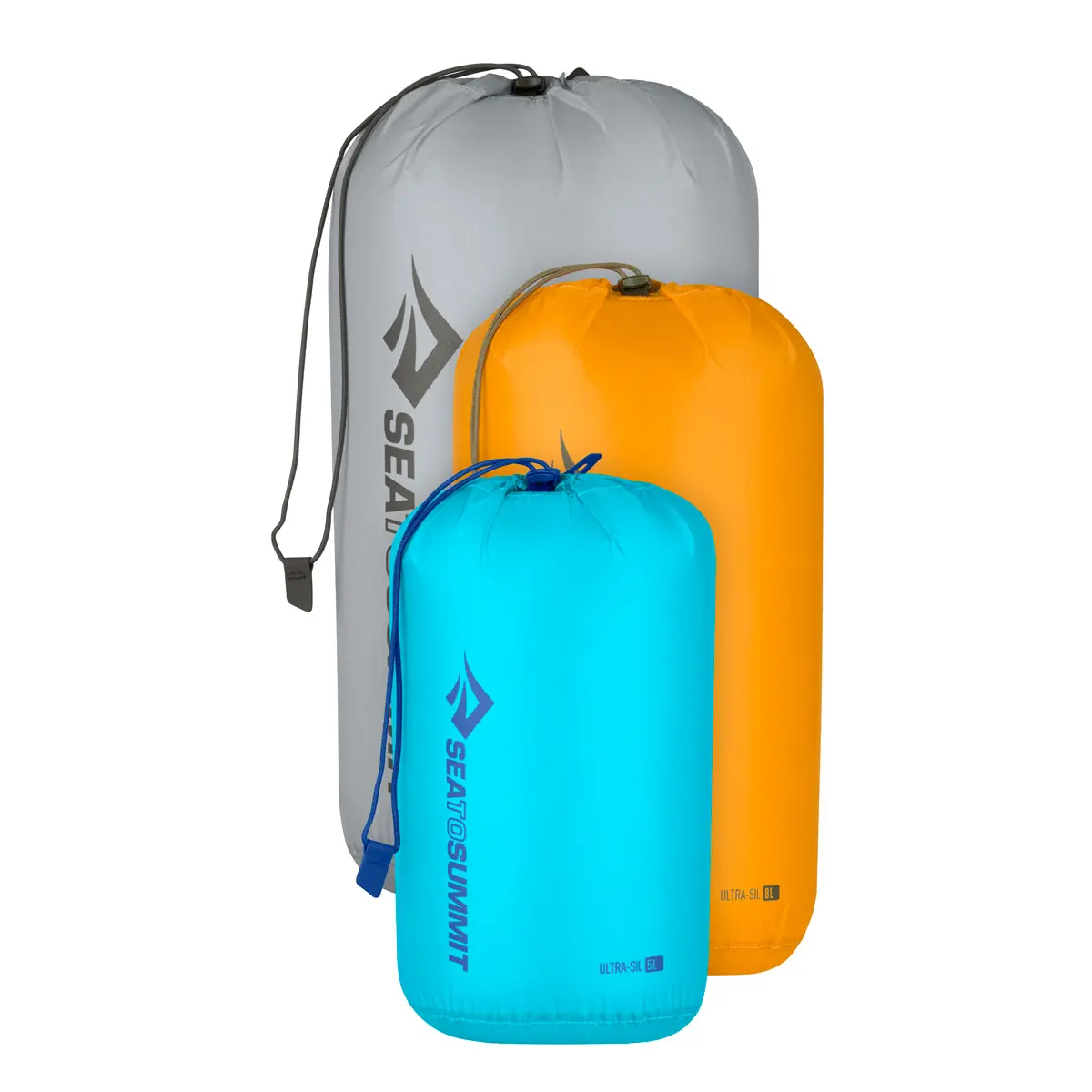 薄手で超軽量の30Dウルトラシル素材を採用したスタッフサックの3サイズセット。摩擦の少ない生地なのでバックパックの狭いスペースにも押し込みやすいです。底部にはグラブハンドルが設けられ、運搬やバックパックへの出し入れに便利。機能と利便性を求めながら軽さも追求するアクティビティにおすすめ。