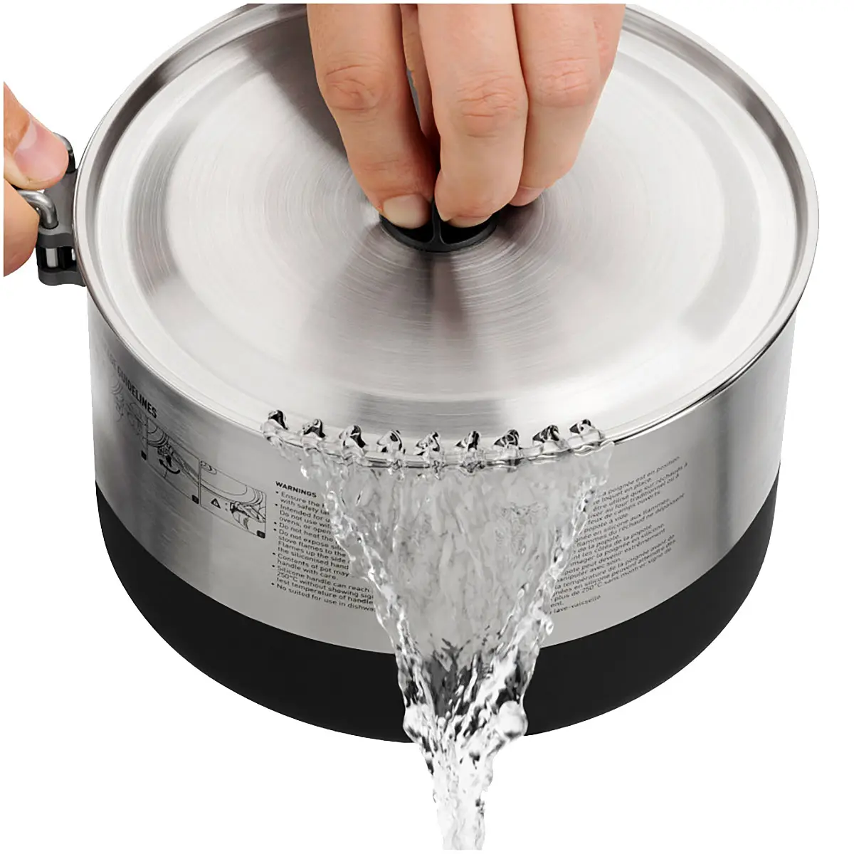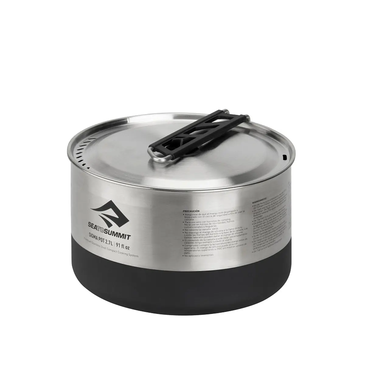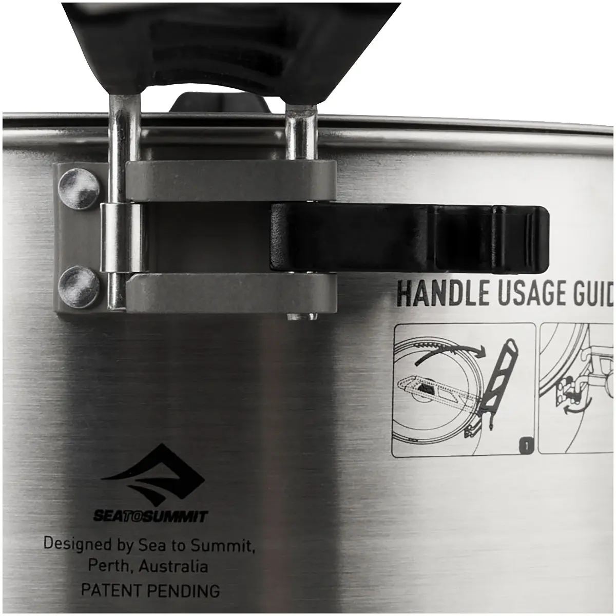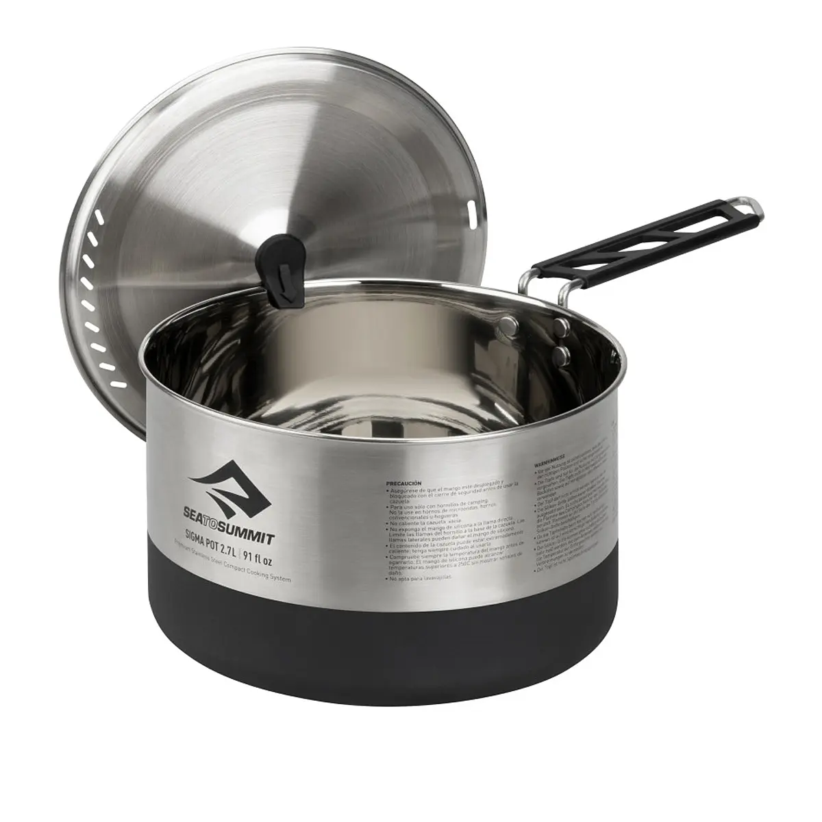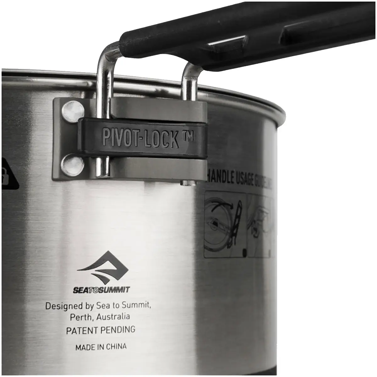高品質でサビに強いマリングレードのステンレスを使用したクックウェア。丈夫で軽く傷つきにくく、お手入れもカンタン。水平方向に展開する「ピボットロック」ハンドルは、収納時/使用時ともカタつきなくしっかりとロックします。また、地面で調理する時にはフタの置き場に困ることがありますが、フタの裏にある「リッドキープ」フックにより、ポットのフチにフタを引っ掛けておくことができます。全てのシグマポットはアルファポットやデルタライト食器類とスタッキングできます。