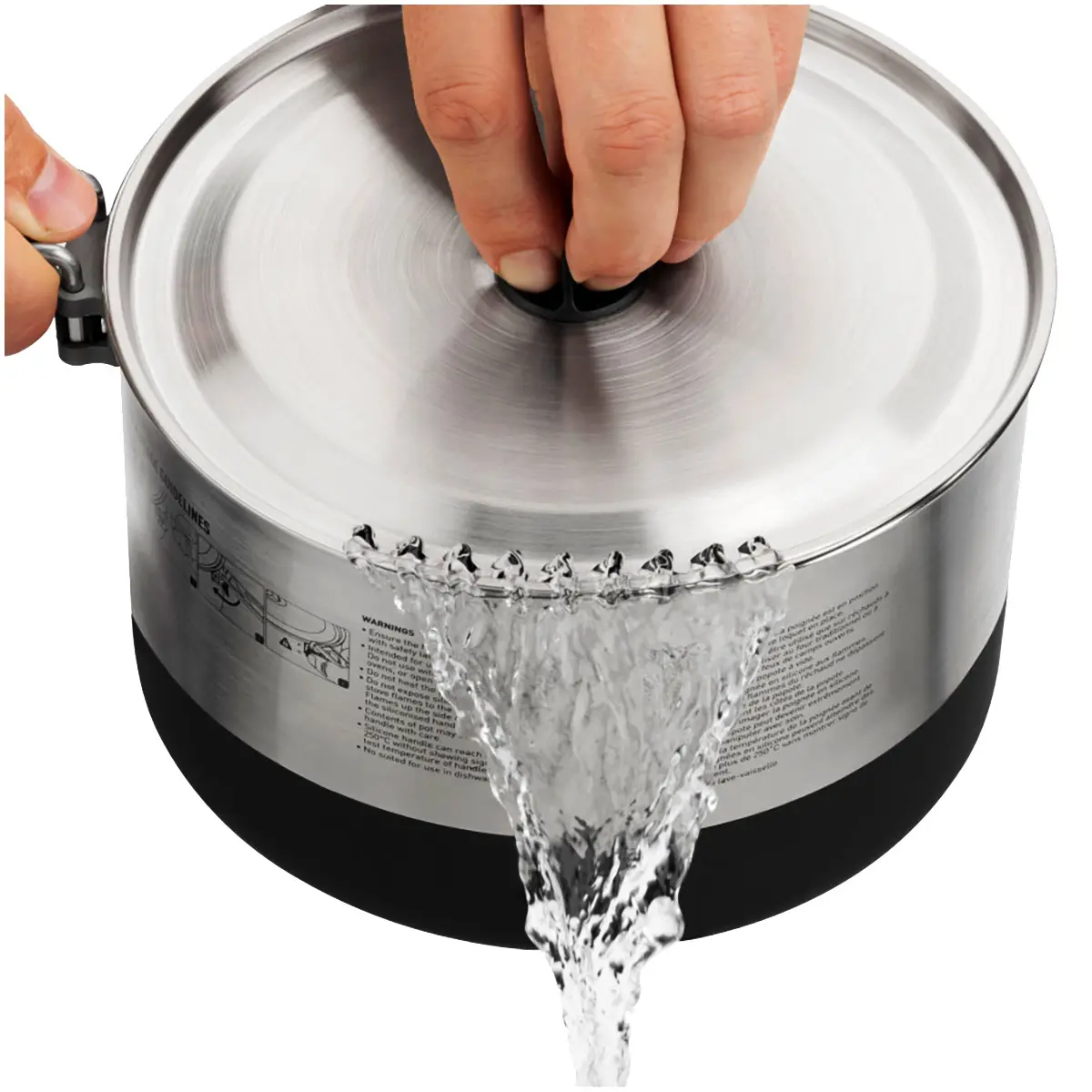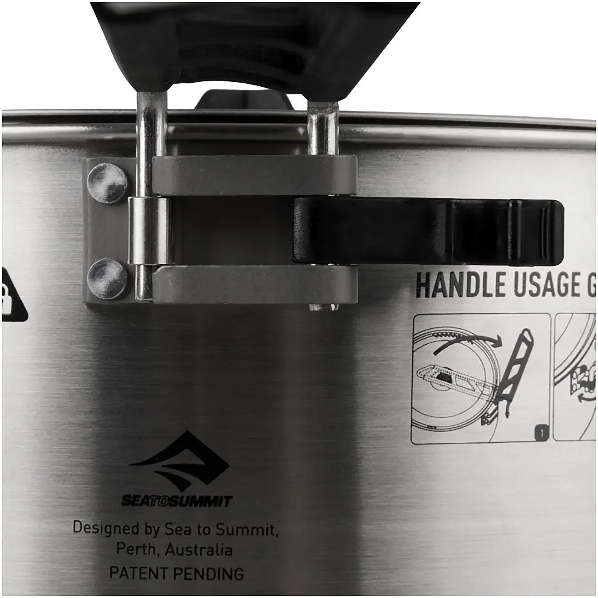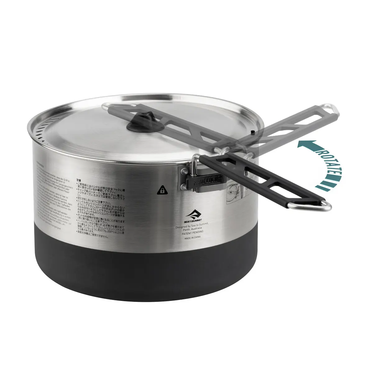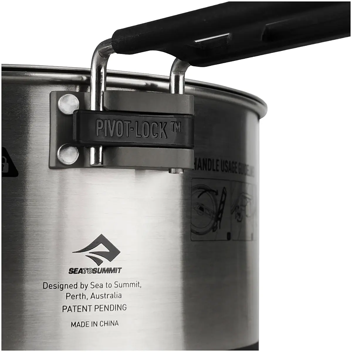 高品質でサビに強いマリングレードのステンレスを使用したクックウェア。丈夫で軽く傷つきにくく、お手入れもカンタン。水平方向に展開する「ピボットロック」ハンドルは、収納時/使用時ともカタつきなくしっかりとロックします。また、地面で調理する時にはフタの置き場に困ることがありますが、フタの裏にある「リッドキープ」フックにより、ポットのフチにフタを引っ掛けておくことができます。全てのシグマポットはアルファポットやデルタライト食器類とスタッキングできます。