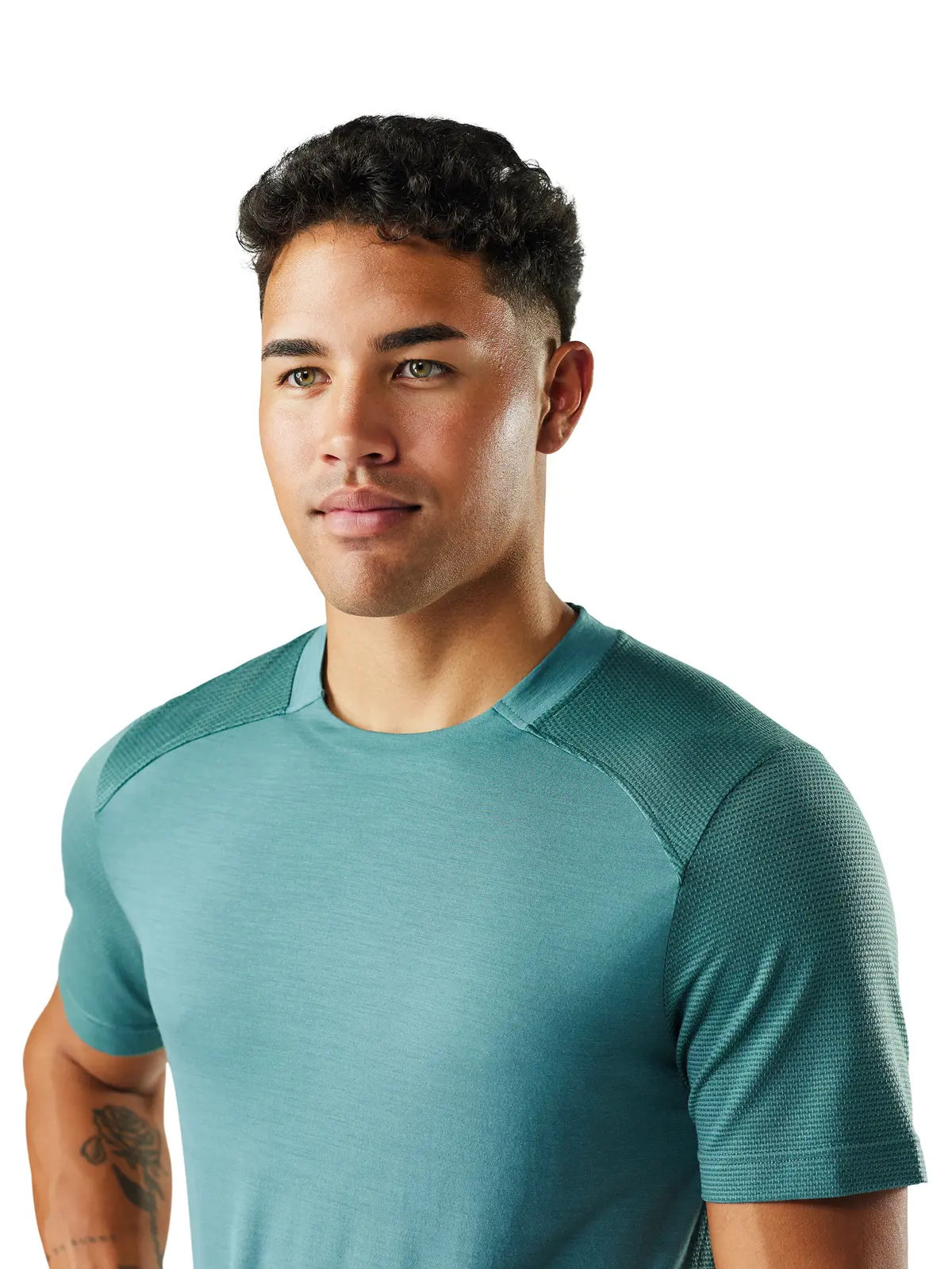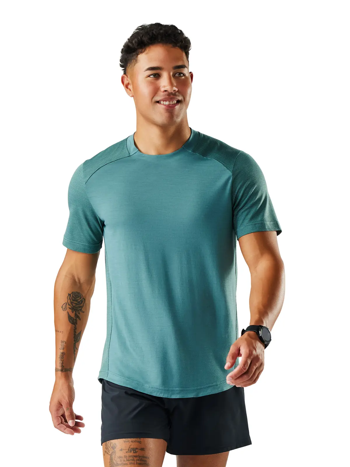 3つのパフォーマンス素材を1つにしたアクティブな人向けの軽量ショートスリーブ。メリノウールの機能性にリサイクルポリエステルの耐久性と速乾性、そしてテンセルの柔軟性と冷却効果を適所に配合。前身頃はメリノウールとテンセルのブレンド素材。肩/袖/後ろ身頃にはメリノウール、テンセル、ポリエステルをブレンドしたメッシュ生地を配置し、通気性と速乾性を持たせました。レギュラーフィットのゆとりあるフィットはランニングやアクティビティの時にまとわりつくことなく快適です。袖と身頃のロゴマークにはリフレクターの役割があります。低山でのトレイルランニングでは1枚で、春から秋の2,000m以下でのハイキングにはベースレイヤーとしても活躍します。