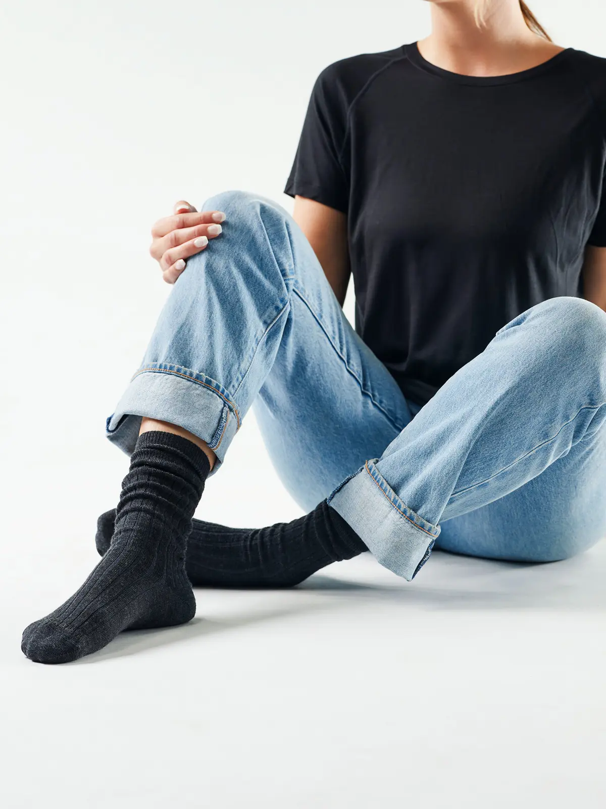 シンプルなリブデザインのソックス。ちょっとした外出から、ソファでくつろぐリラックスタイムまで、メリノウールならではの防臭性や温度調節機能を日常に。確かなフィット感とアーチサポートを備え、靴の中でのズレを抑えて快適な歩行をサポート。つま先の不快なゴロつきを解消する独自のニッティング技術に加え、爪による摩耗の補強も施されています。女性の足の形状に合わせ、かかと部分を細めに設計されています。