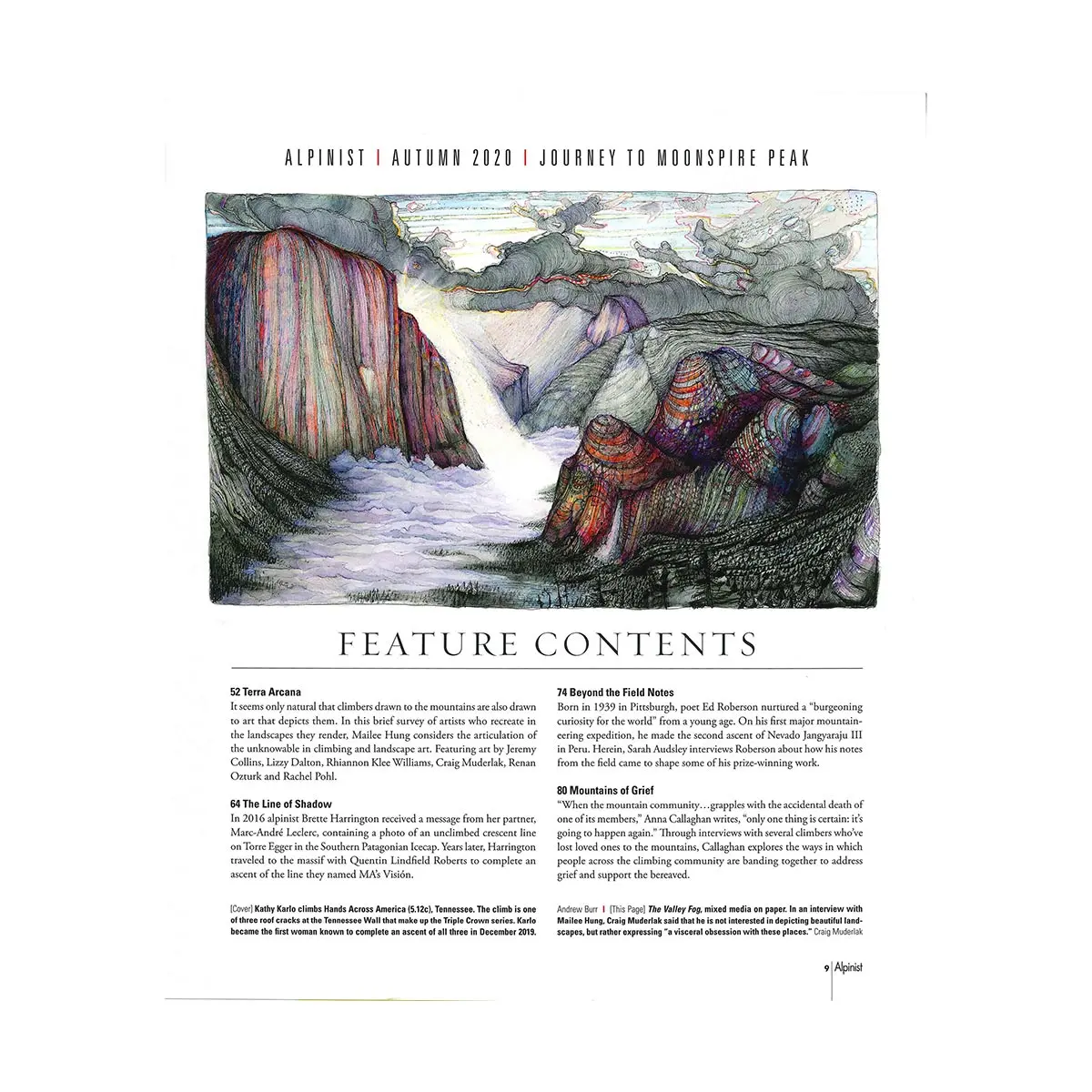 「山に惹かれるクライマーが、山を描いたアートにも惹かれるのは当然のことのように思えます」 マイリー・ユンは、アーティストたちの描く風景から、クライミングとランドスケープ・アートにおける「未知なるもの」の表現についてひもときます。ジェレミー・コリンズら6人の作品を掲載しています。