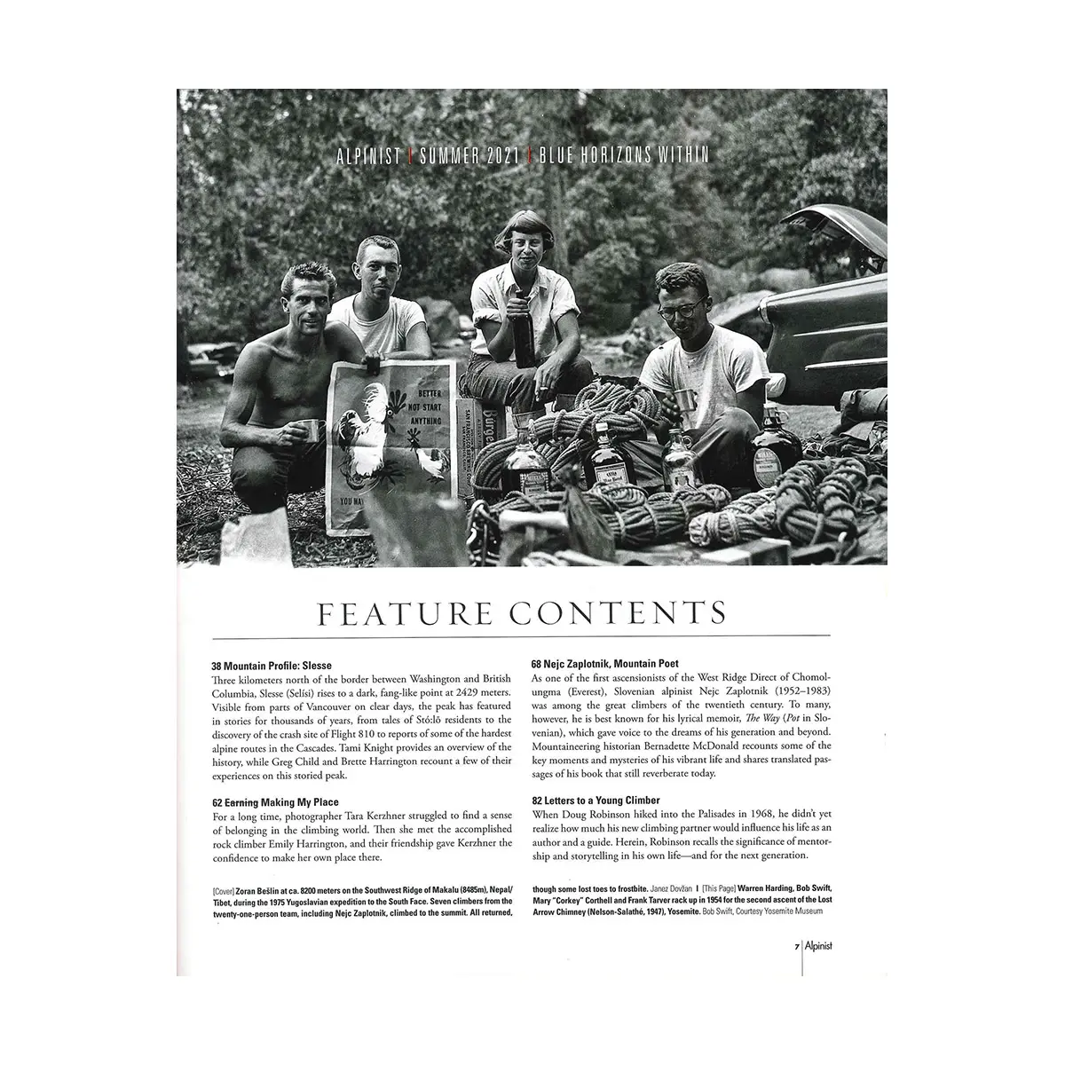 カバーフォト:マカルー(8,485m、ネパール/チベット)南西稜、8,200m付近でのゾラン・ベシュリン。1975年のユーゴスラビア隊による南壁遠征では21人のチーム中、ネイツ・ザプロトニクを含む7人のクライマーが登頂に成功。凍傷で足の指を失った者もいましたが無事全員が下山しました。