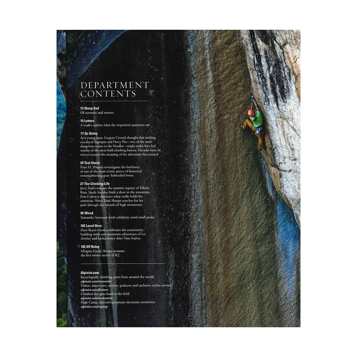 アメリカとカナダの国境に聳える花崗岩の尖塔、mt.スレス(2,429m)の黒い牙のようなピークの連なりは、晴れた日にはバンクーバー市街からも遠望できます。この山は何千年も前から数々の物語に登場してきました。4,000~10,000年前に遡る先住民の歴史、1956年に山の上部に激突し62名が死亡したカナダ航空機の事故、そして近年展開されているカスケード山脈で最も困難なアルパインクライミングの報告をタミ・ナイトが紹介します。さらにグレッグ・チャイルドとブレット・ハリントンが自身のクライミング体験を語ります。