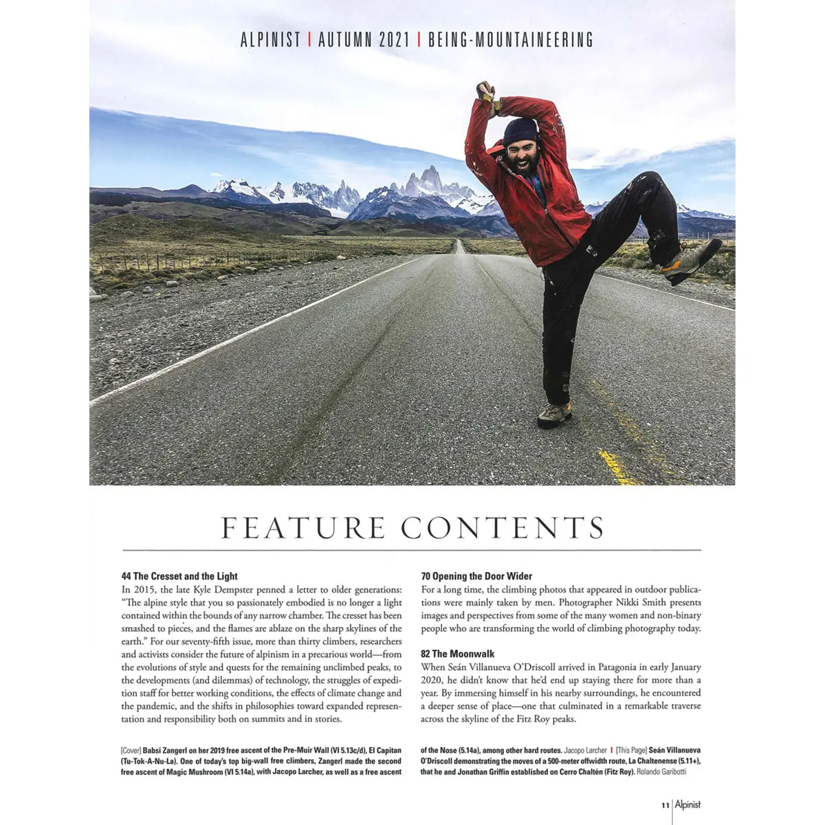 「あなたが情熱を持って体現したアルパインスタイルは、狭い部屋に収まらない光となっています。火籠は粉々に砕かれ、精神の炎は地球の鋭いスカイラインの彼方で燃え上がっています」2016年カラコルムで消息を絶った故カイル・デンプスターは、その前年に年配クライマーに向けて手紙を書いていました。クライマーや研究者、活動家ら30人以上がこの不安定な世界におけるアルピニズムの未来について考察。クライミングスタイルの進化と残された未登峰への探求、テクノロジーの発展とそのジレンマ。より良い労働条件を求める遠征隊のサポーター、そして現代アルピニズムは気候変動とパンデミックの影響を受けて変化と問題を抱えています。