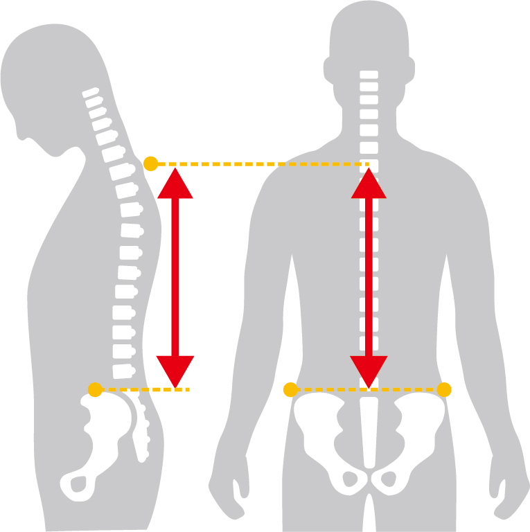 背面長はメジャーを使用して、首の後ろの一番とび出している骨(第7頸骨)から腰骨上端までの長さを、背骨の曲線に沿わせるようにして測ります。