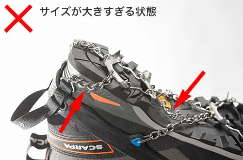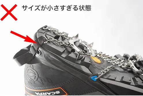 ブラックダイヤモンド・トラクションディバイスの性能を引き出し、安全にご使用いただくために、ブーツやシューズに正しくフィットするかどうかをご確認ください。