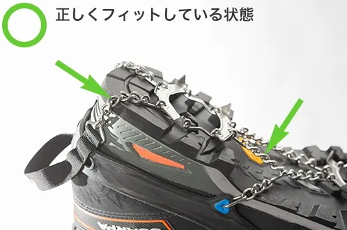 フィッティングの状態は実際に使用する靴にトラクションディバイスをセットして「チェーンのたるみ」と「かかとへのチェーンのかかり具合」をチェックして判断することができます。